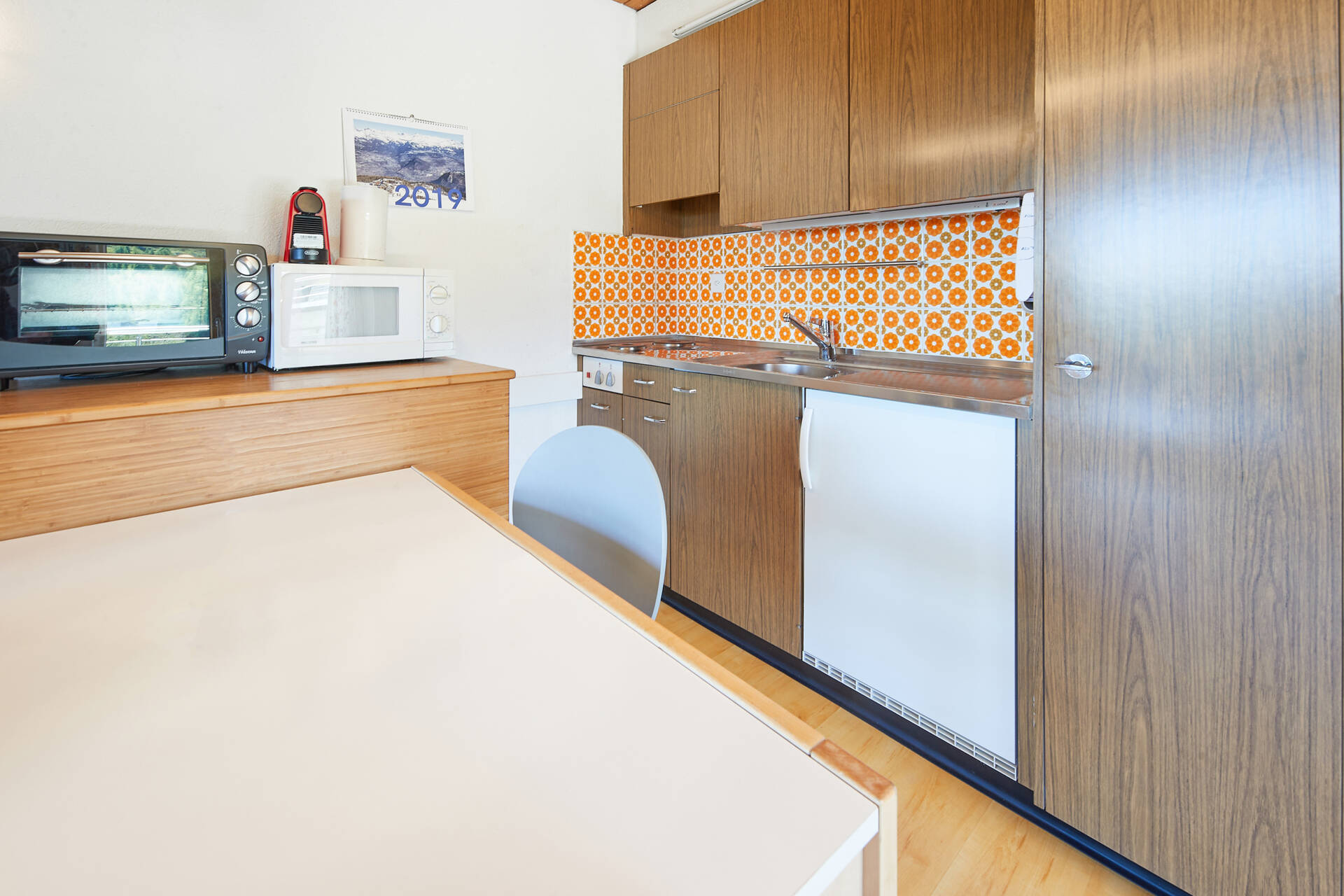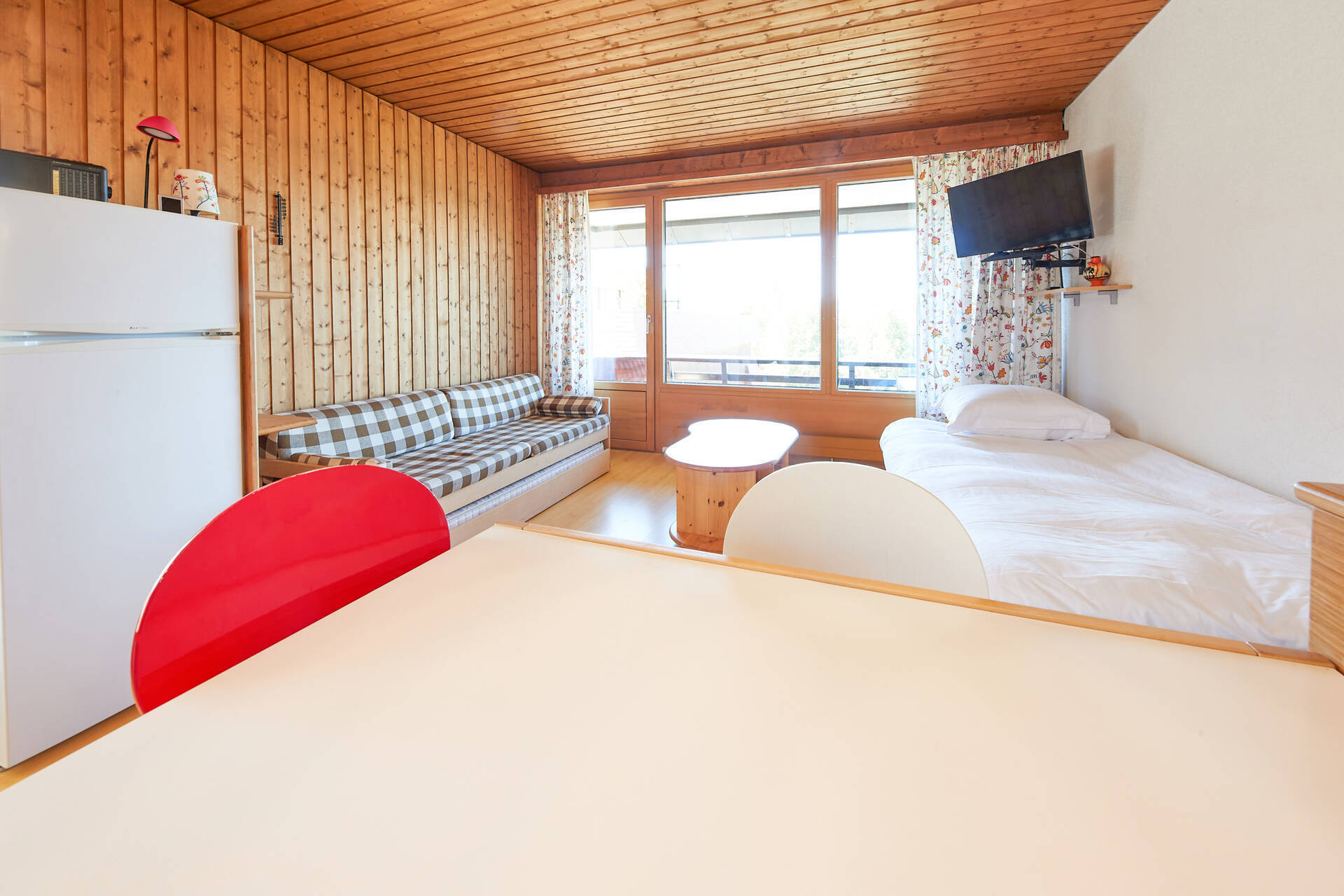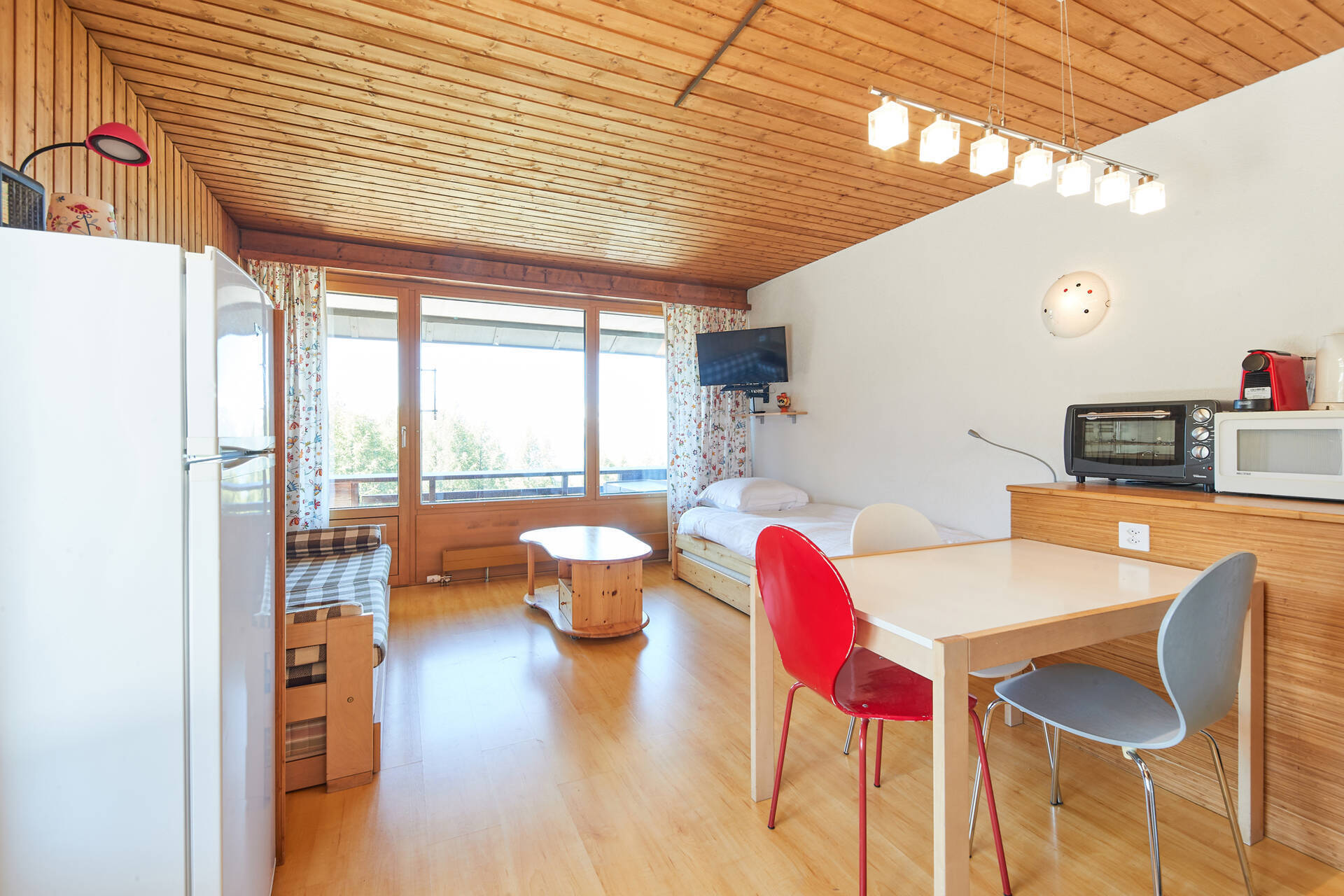 neuStudio (Typ D) für 3 Personen im 4. Stock des Gebäudes Essert in Thyon 2000. Sie verfügt über eine offene Küche: 2 Kochplatten, kleinen Backofen und Kühlschrank mit kleinem Gefrierfach. Das Wohnzimmer, mit TV, besteht aus einem Sitzbereich (1 Einzelgleitbett 1.90 X 0.80 und einem Doppelgleitbett) und einer Essecke. Badezimmer: WC, Waschbecken und Badewanne. Terrasse in Richtung Süd-Osten mit Aussicht auf das Zentralplatz von Thyon 2000 und die Alpen. Wohnung OHNE Teppichboden. Tiere erlaubt.