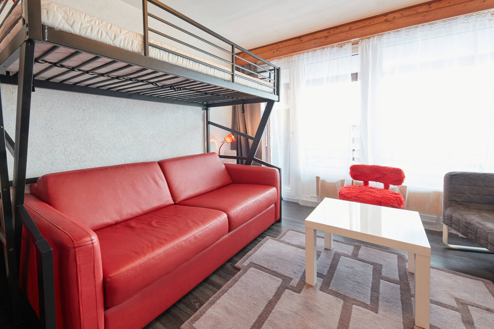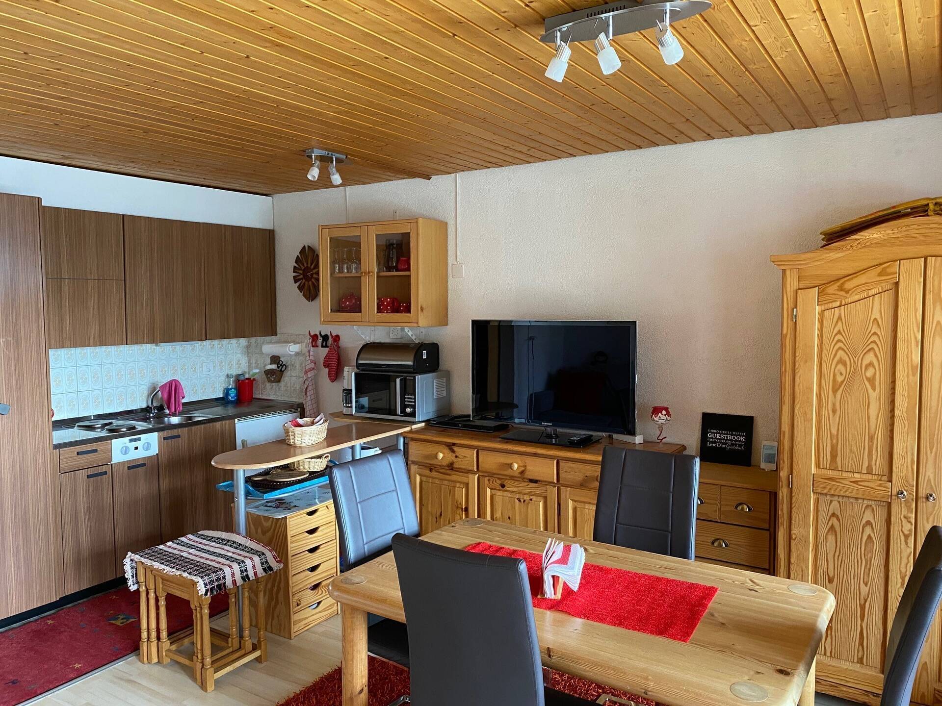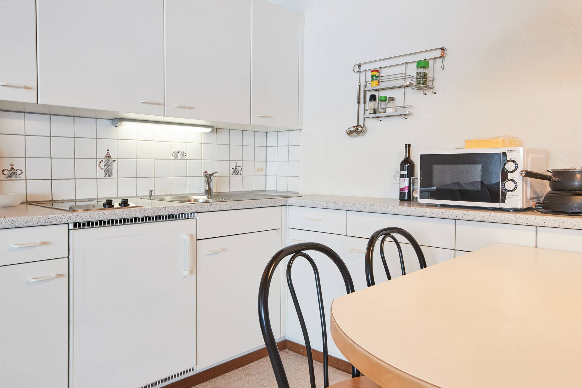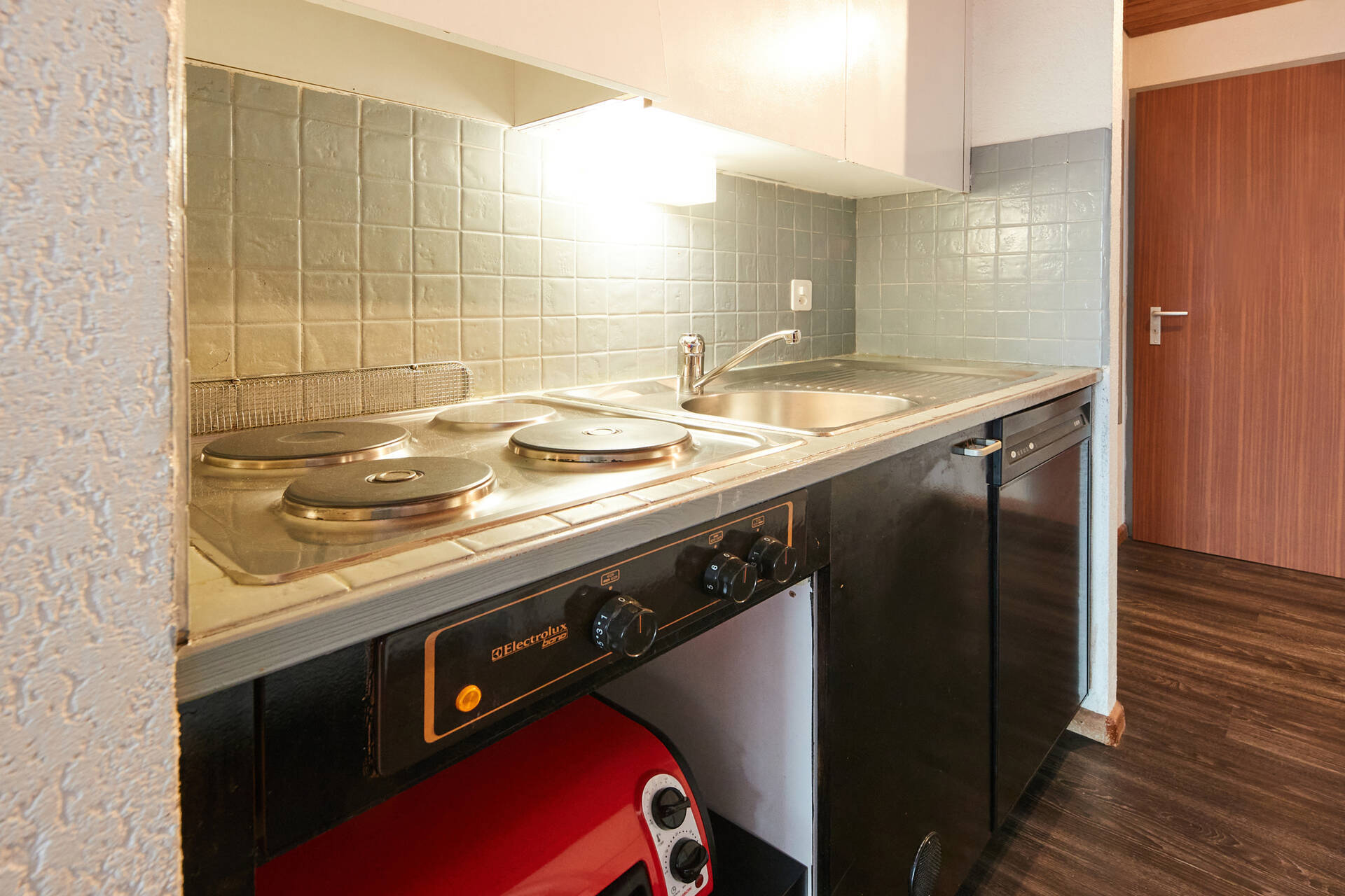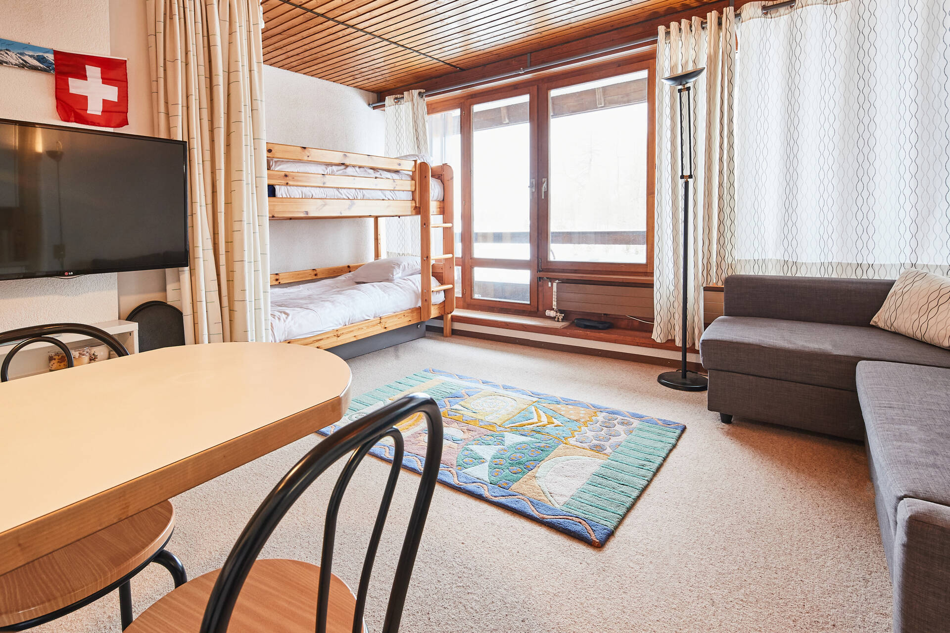 Studio (Typ D) für 4 Personen im 4. Stock des Gebäudes Greppon in Thyon 2000. Sie verfügt über eine offene Küche: 4 Kochplatten, Kühlschrank, Backofen und Mikrowellen. Das Wohnzimmer, mit TV und WLAN, besteht aus einem Sitzbereich (1 Sofa, 1 Bettsofa 160 X 200 und einem Wandklappbett 1.90 X 0.90) und einer Essecke. Badezimmer: WC, Waschbecken und Badewanne. Balkon in Richtung Nord-Osten mit Aussicht auf das Rhône Tal. Wohnung OHNE Teppichboden. Tiere erlaubt.