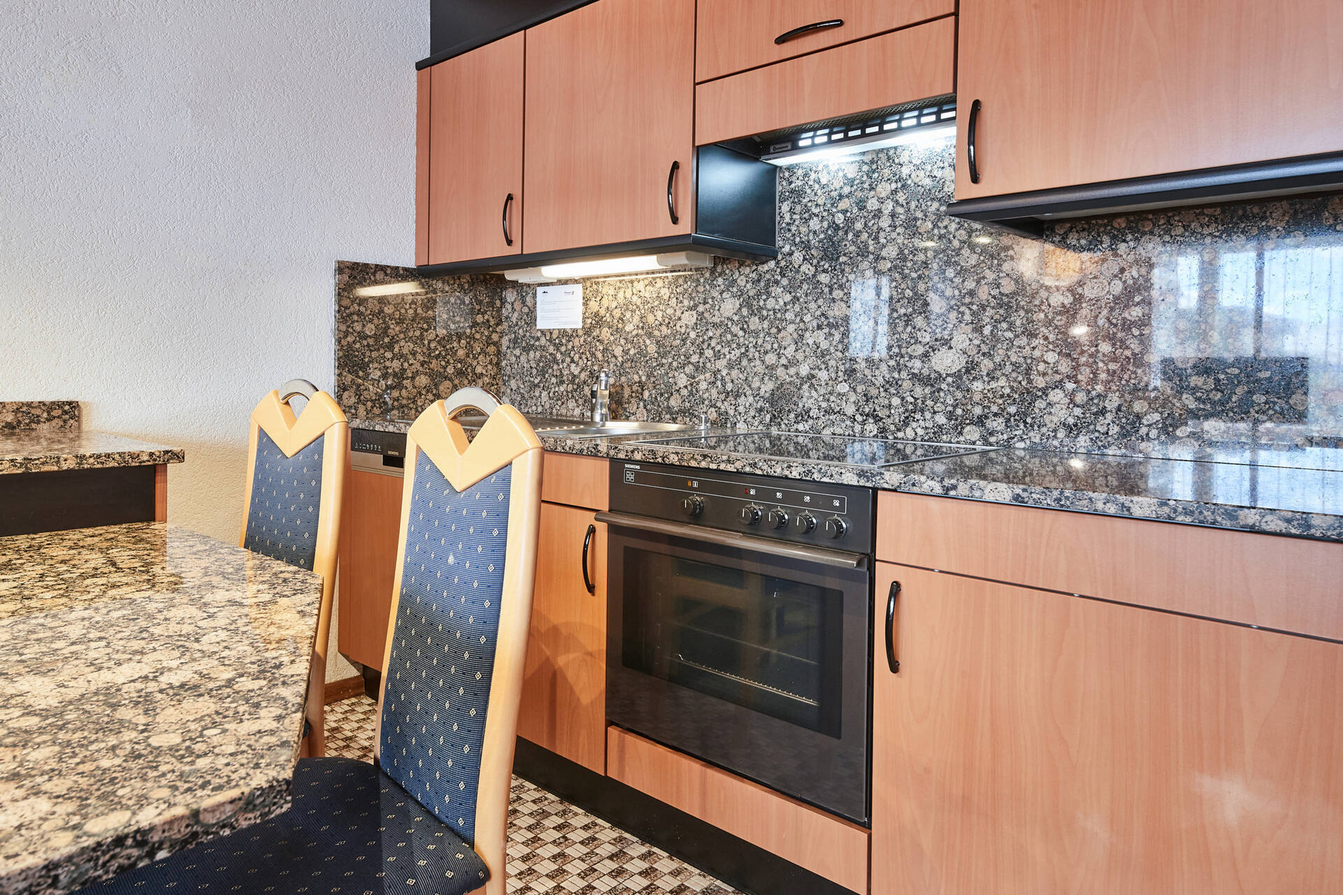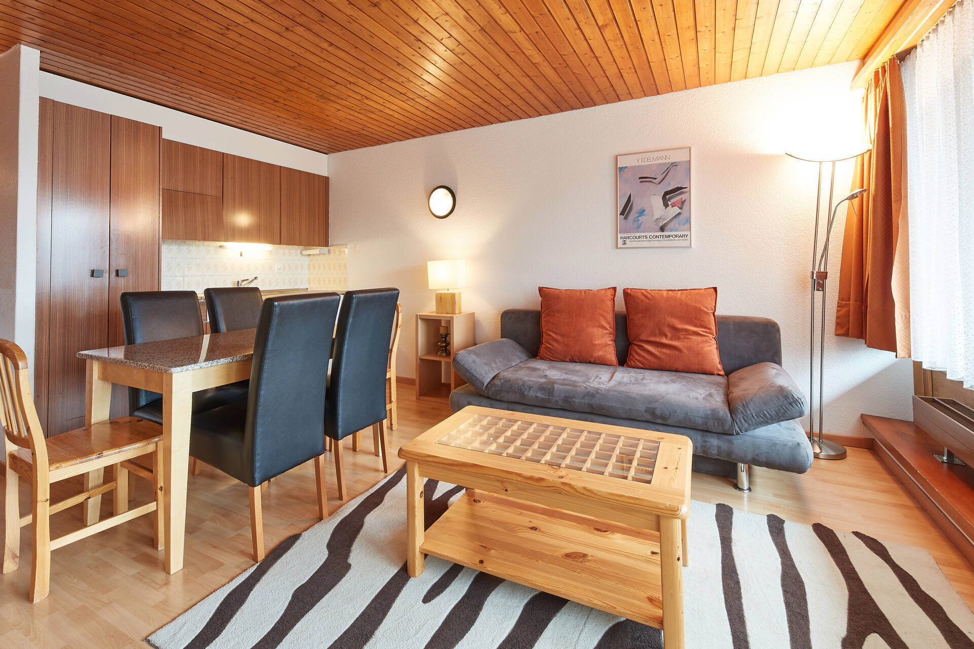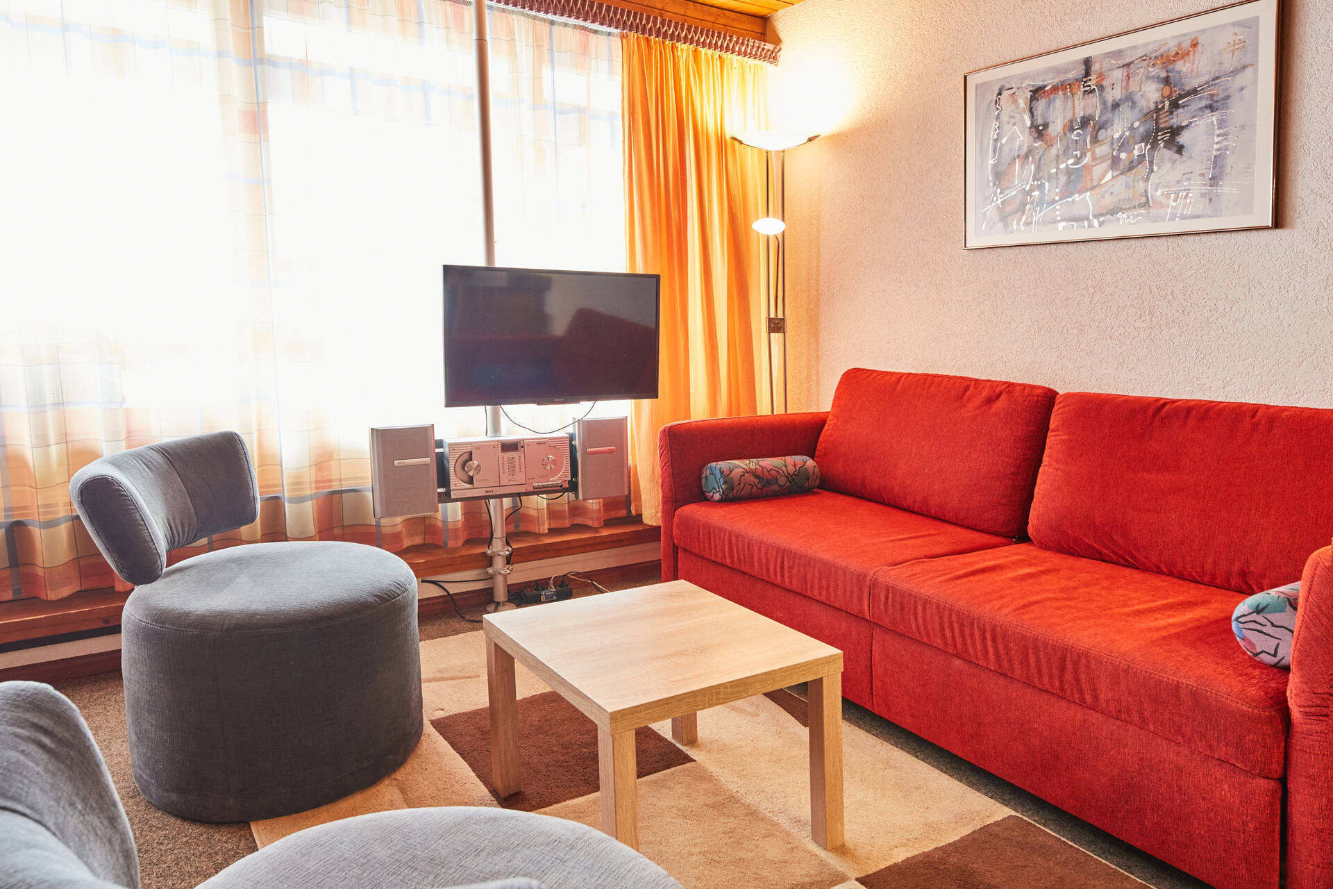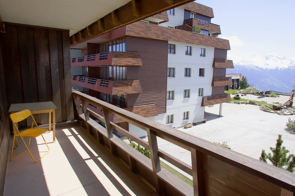 neu1-Zimmer-Wohnung für 4 Personen (Typ D), im dritten Stockwerk des Gebäudes Greppon in Thyon 2000. Sie verfügt über eine offene Küche mit Laminatboden, 3 Kochplatten, einen kleinen Backofen und eine Geschirrspülmaschine. Das Wohnzimmer ist mit einem Schrankklappbett (90/190), einem Doppelschlafsofa (160/190) oder einem Hochdoppelbett, TV, WIFI und einer Essecke ausgestattet. Im Badezimmer, gibt es ein WC, ein Waschbecken und eine Badewanne. Ein angenehmer Balkon, Richtung Westen, gibt Blick auf die Gebäude Wildhorn, die Walliser und die Waadtländer Alpen. Wohnung OHNE Teppisch. Tiere nicht erlaubt.