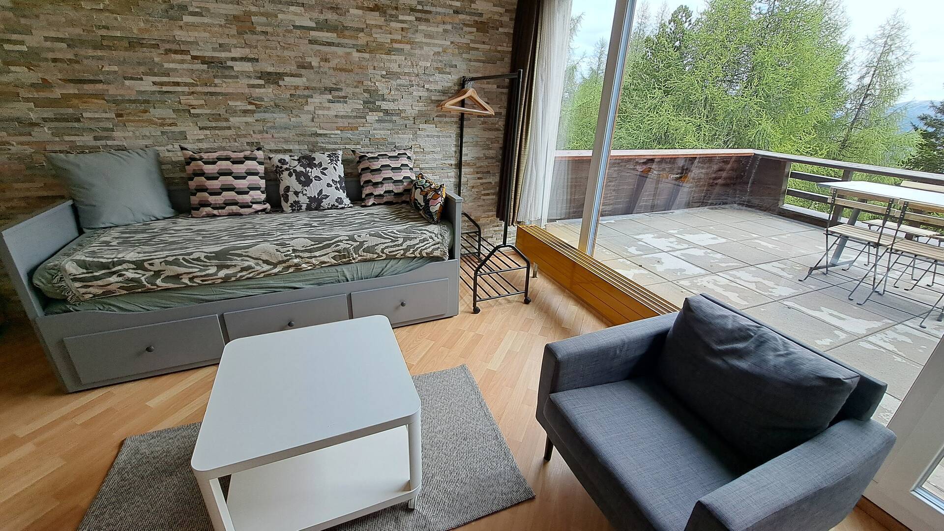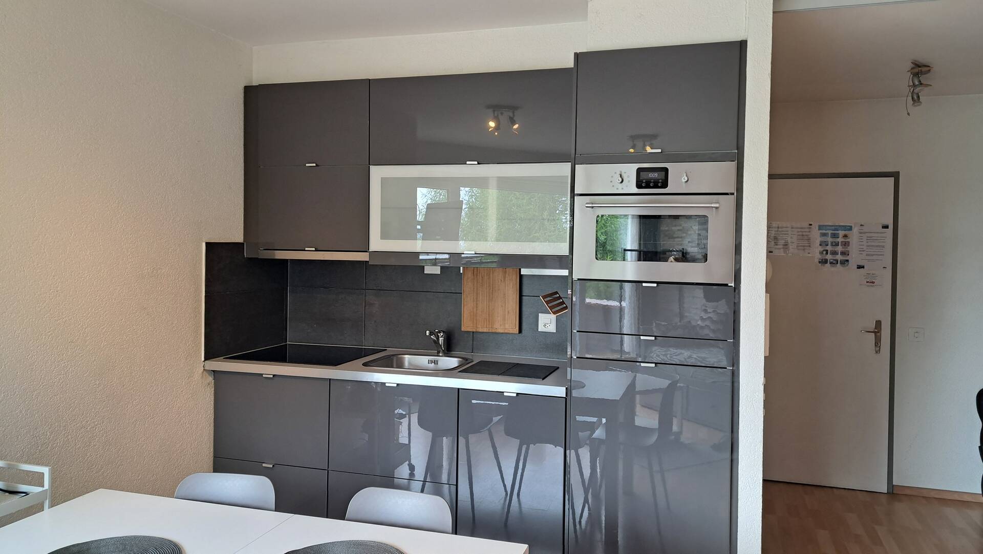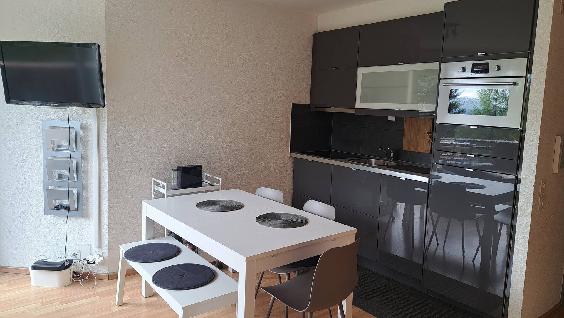 neuStudio (Typ E) für 4 Personen im Erdgeschoss des Gebäudes Blava in Thyon 2000. Sie verfügt über eine offene Küche: 4 Kochplatten, Backofen, Geschirrspüler, Kühlschrank und Gefrierer. Das Wohnzimmer, mit TV, besteht aus einem Sitzbereich (ein Schlafsofa 2.00 X 1.60 und einem Stockbett 2.00 X 0.90) und einer Essecke. Badezimmer: WC, Waschbecken und Badewanne. Terrasse in Richtung Süd-Osten mit Aussicht auf die 4000m-Kette. Wohnung OHNE Teppichboden. Tiere nicht erlaubt.