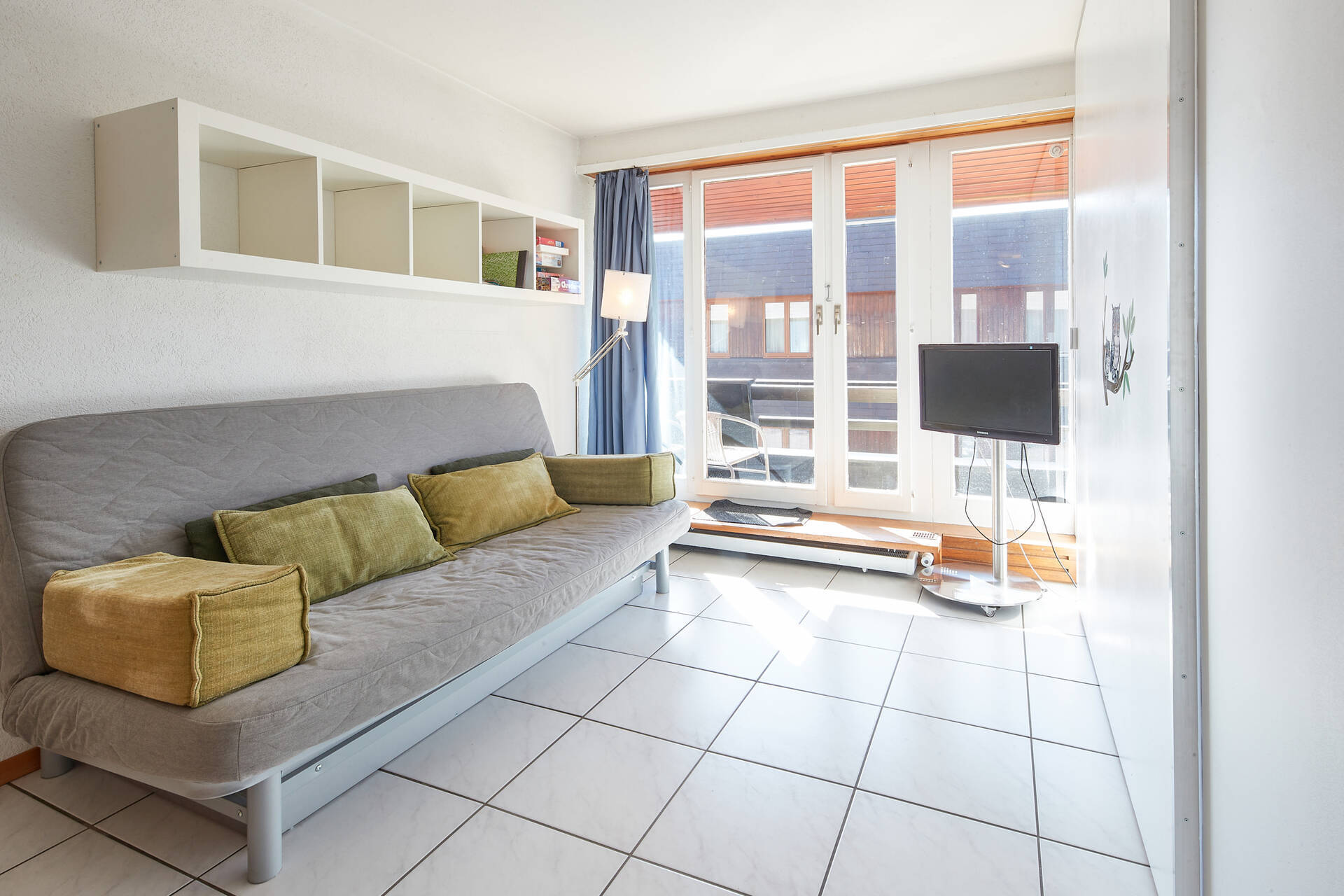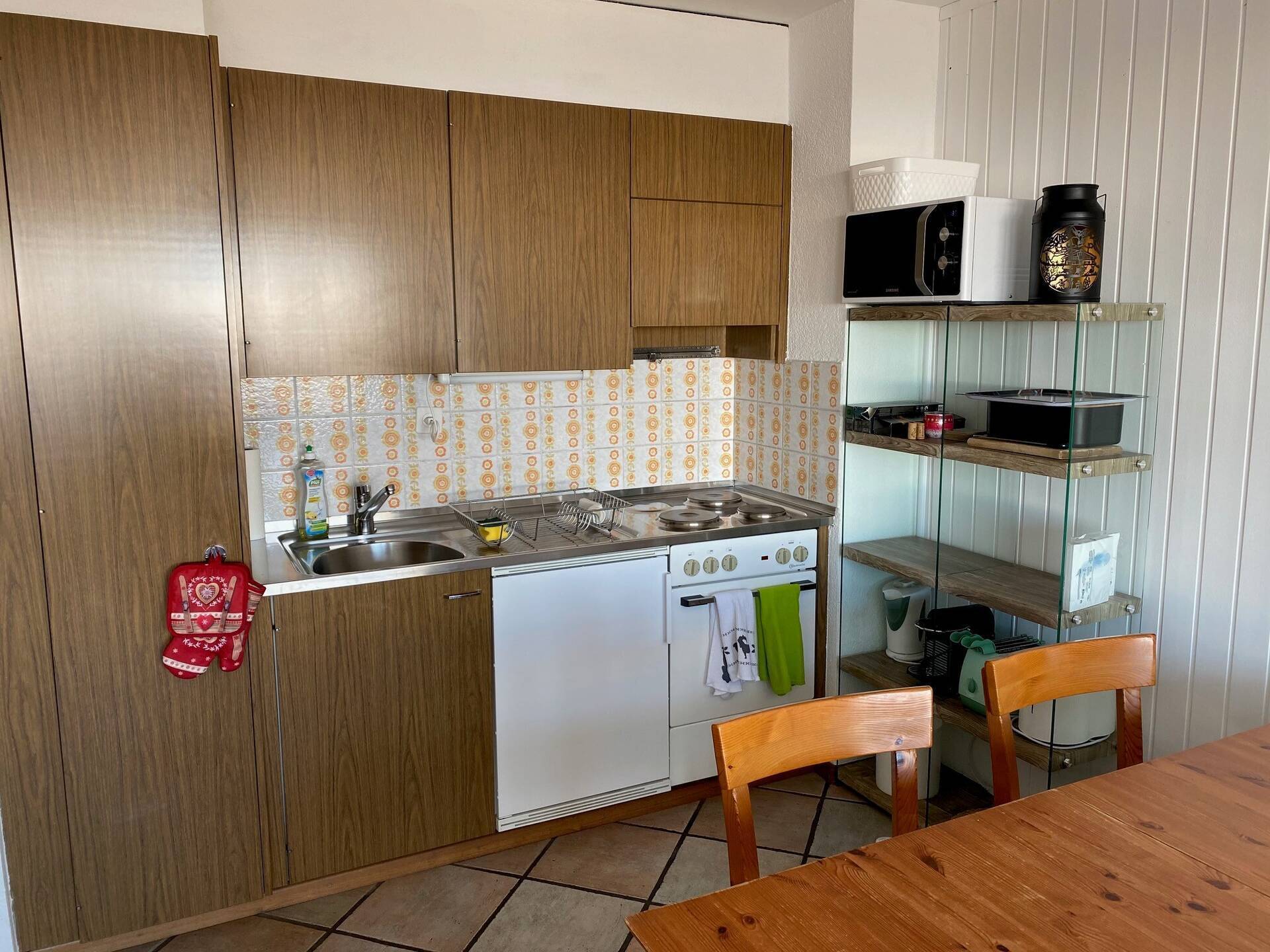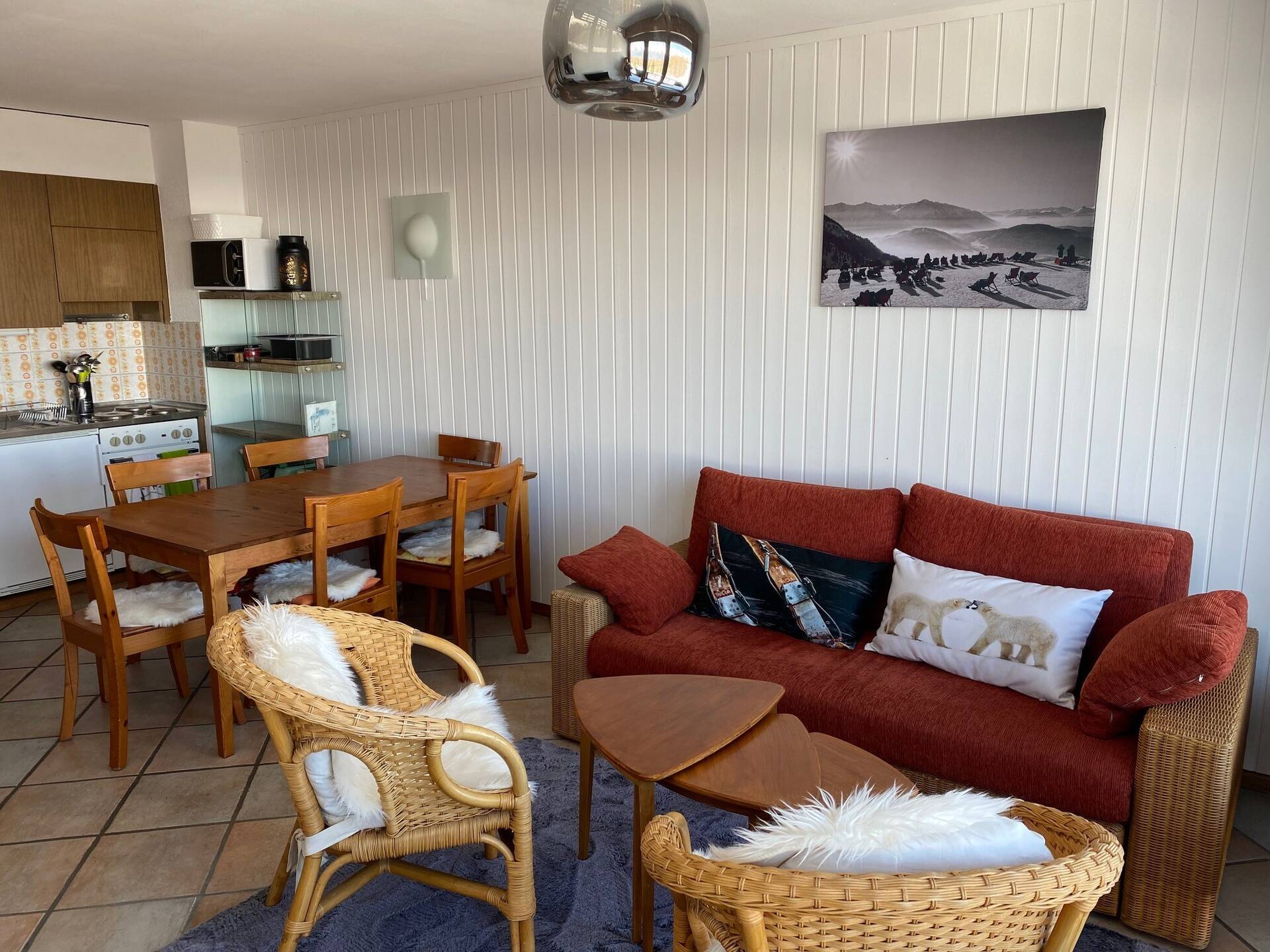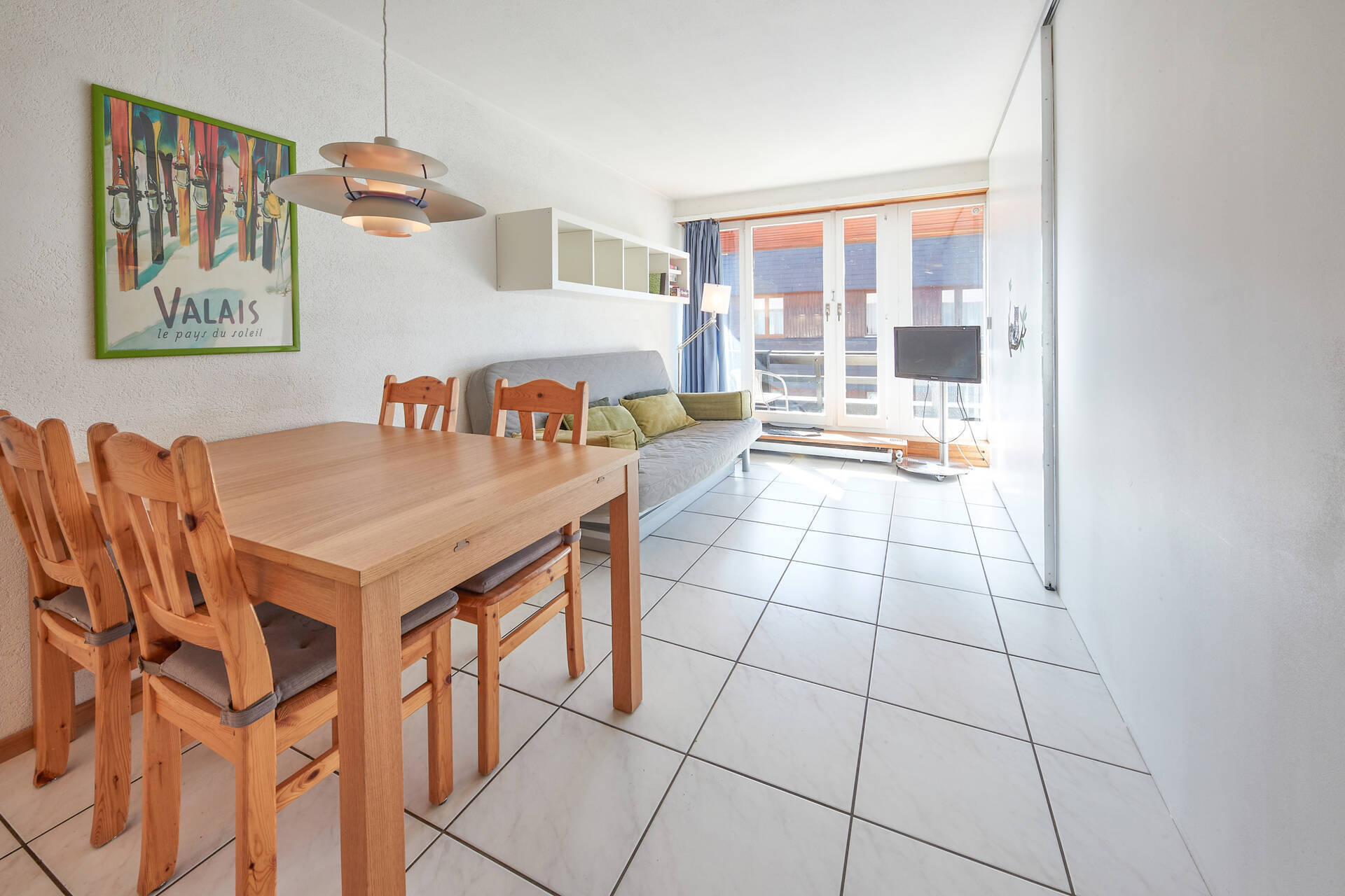 neu2-Zimmer-Wohnung (Typ H) für 4 Personen im 5. Stock des Gebäudes Rawyl in Thyon 2000. Sie verfügt über eine offene Küche: 3 Kochplatten, Backofen und Kühlschrank mit kleinem Gefrierfach. Das Wohnzimmer, mit TV und WIFI, besteht aus einem Sitzbereich (2 Sesseln und 1 Doppelschlafsofa) und einer Essecke. Schlafzimmer mit einem Doppelbett (2 Matratzen 2.00 X 0.90). Badezimmer: WC, Waschbecken und Badewanne. Balkon in Richtung Westen mit Aussicht auf die Waadtländer Alpen. Wohnung MIT Teppichboden. Tiere nicht erlaubt.