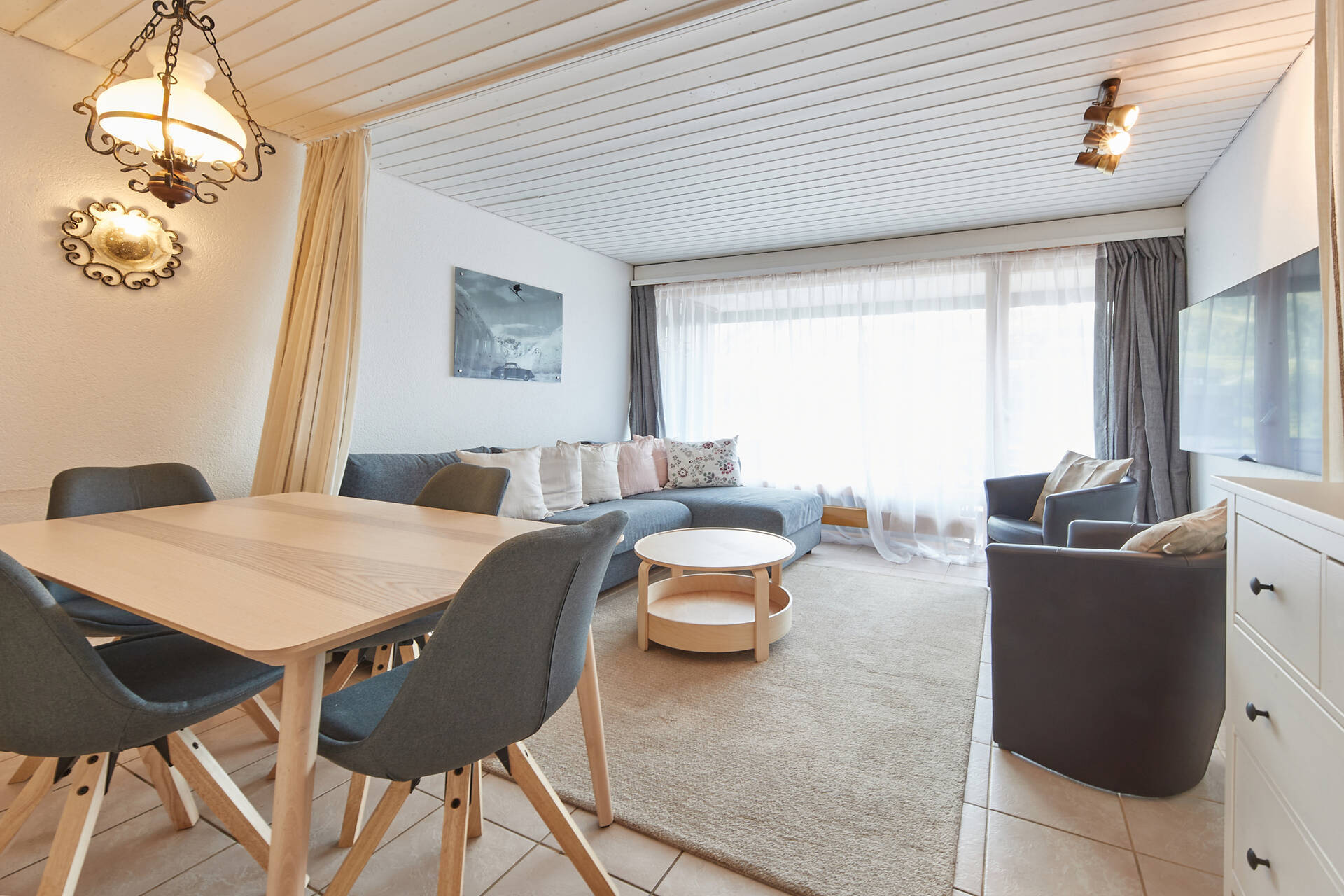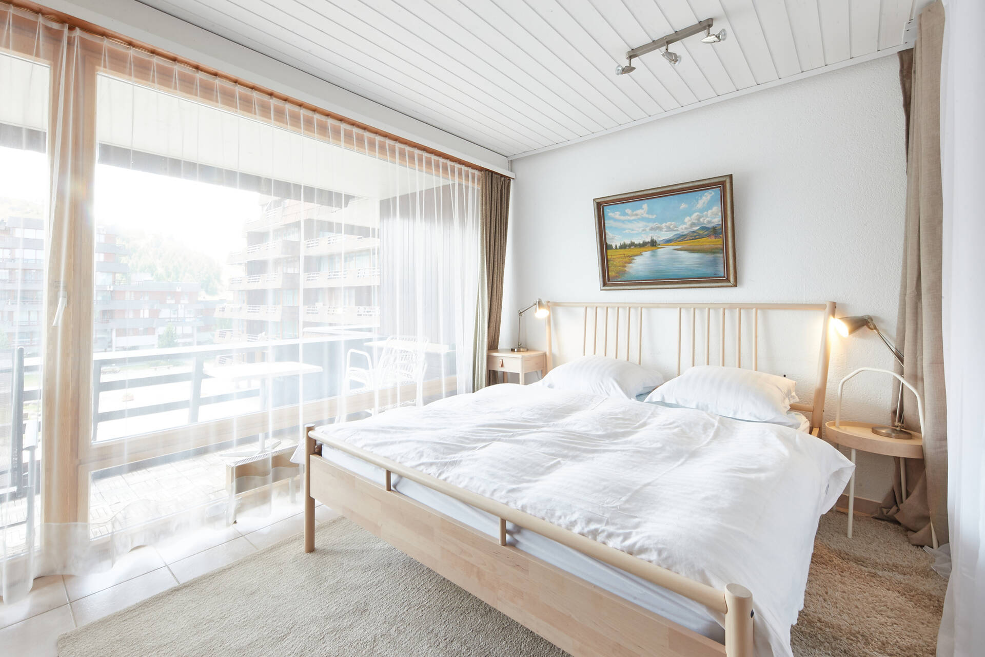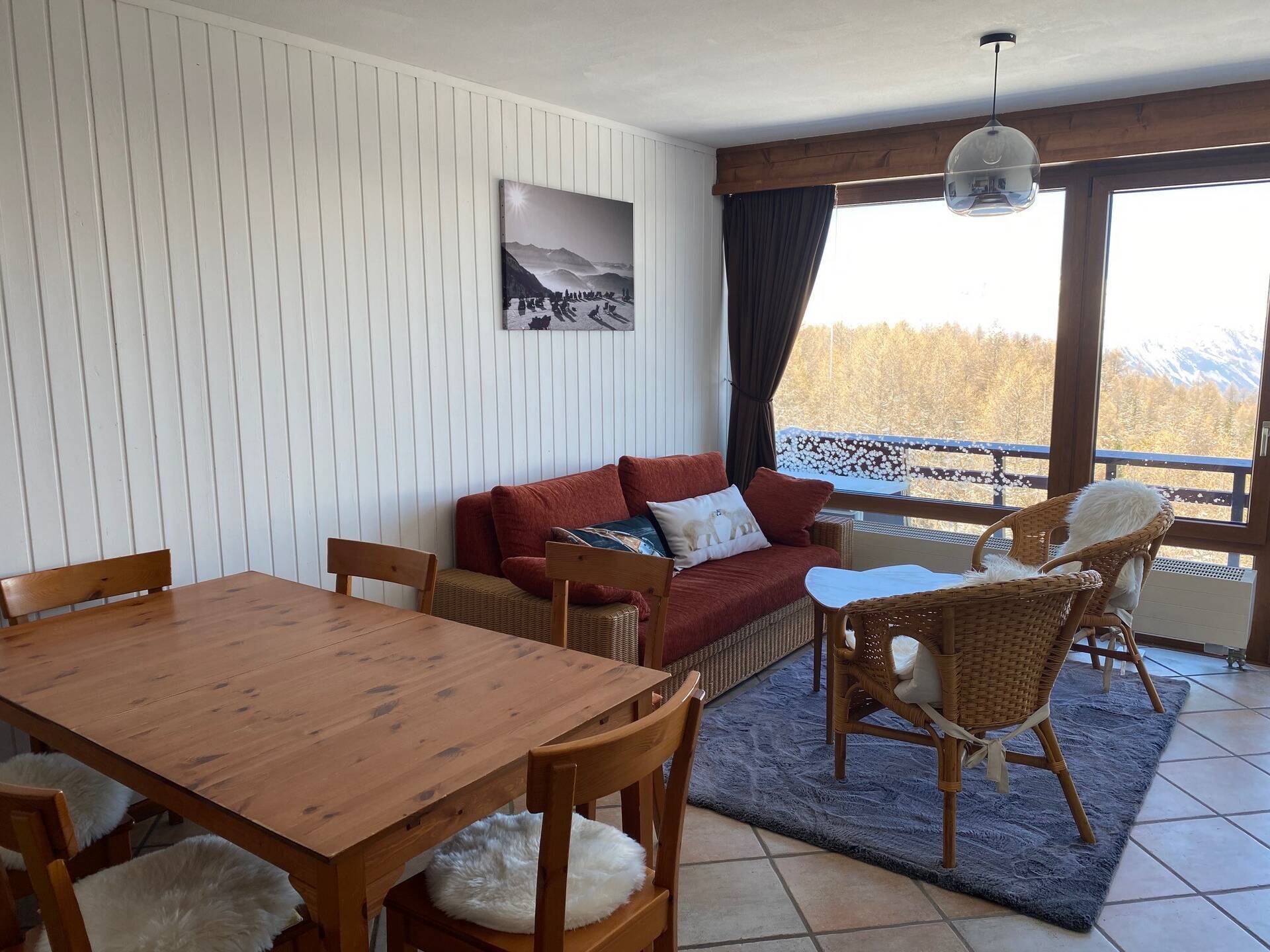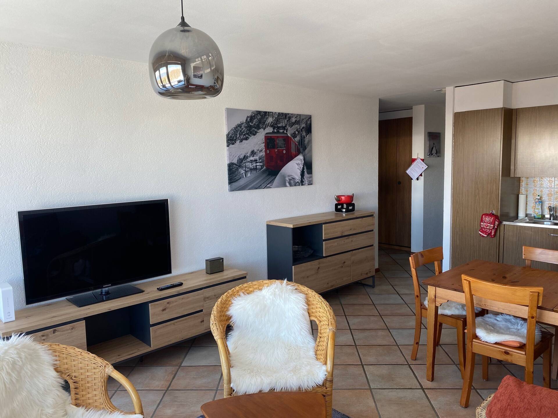 neu2-Zimmer-Wohnung (Typ H) für 4 Personen im 5. Stock des Gebäudes Rawyl in Thyon 2000. Sie verfügt über eine offene Küche: 3 Kochplatten, Backofen und Kühlschrank mit kleinem Gefrierfach. Das Wohnzimmer, mit TV und WIFI, besteht aus einem Sitzbereich (2 Sesseln und 1 Doppelschlafsofa) und einer Essecke. Schlafzimmer mit einem Doppelbett (2 Matratzen 2.00 X 0.90). Badezimmer: WC, Waschbecken und Badewanne. Balkon in Richtung Westen mit Aussicht auf die Waadtländer Alpen. Wohnung MIT Teppichboden. Tiere nicht erlaubt.
