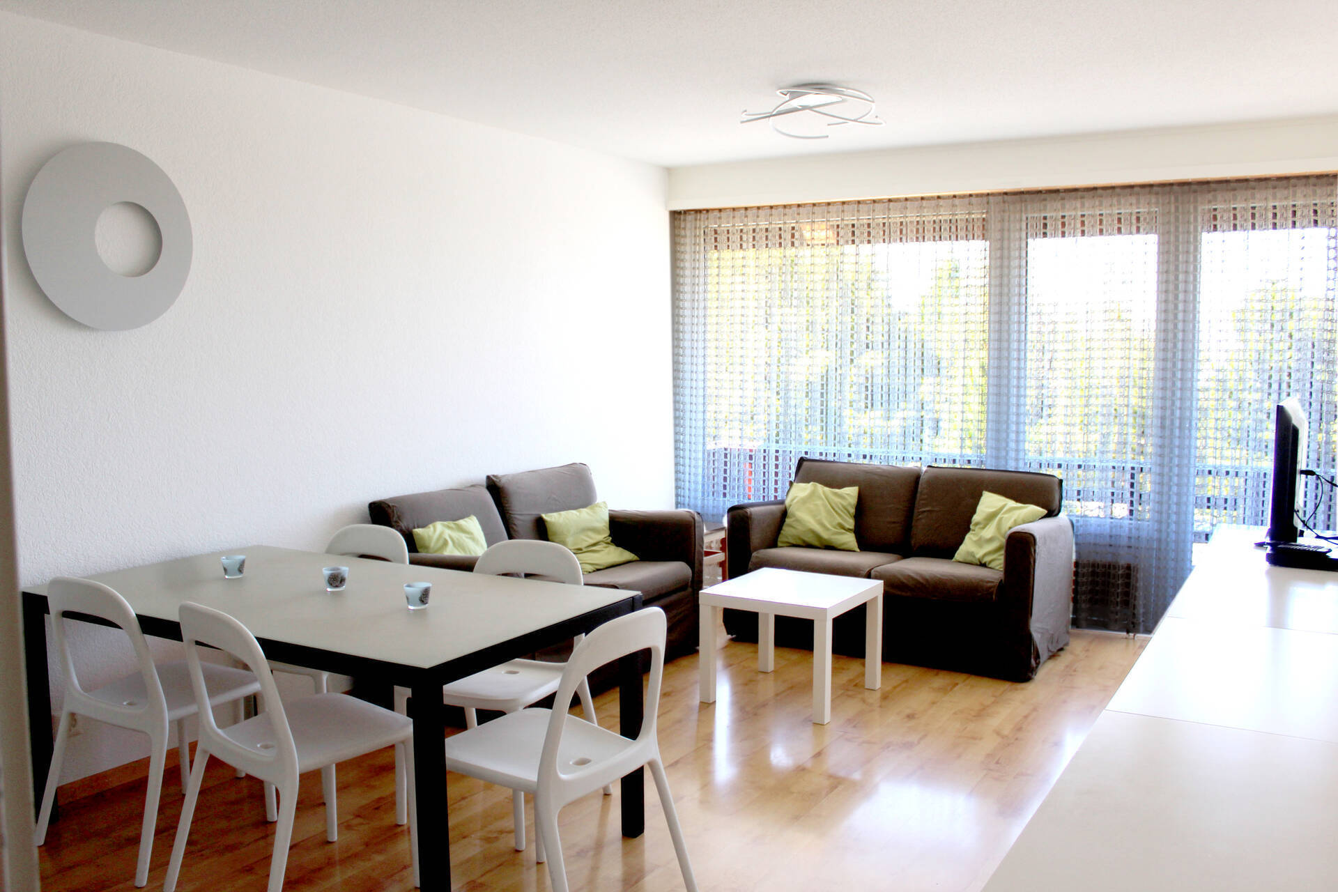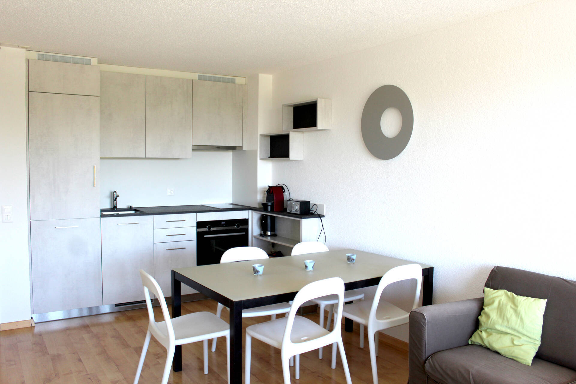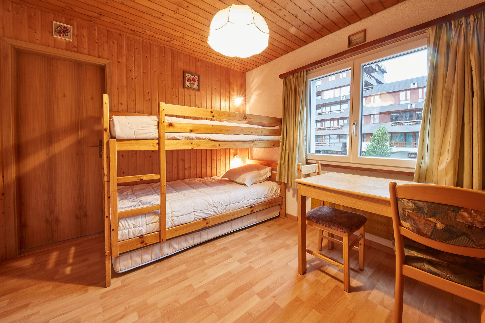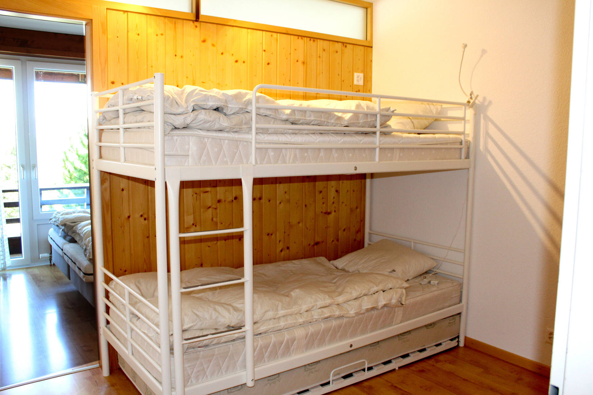 neu3-Zimmer-Wohnung (Typ L) für 5 Personen im 1. Stock des Gebäudes Flache in Thyon 2000. Sie verfügt über eine offene Küche: 4 Glaskeramikkochfelder, Backofen, Geschirrspüler und Kühlschrank mit kleinem Gefrierfach. Das Wohnzimmer, mit TV und WIFI, besteht aus einem Sitzbereich (1 Doppelschlafsofa) und einer Essecke. Schlafzimmer mit Doppelbett (2 Matratzen 2.00 X 0.90) und Kinderzimmer auch mit Doppelbett (2 Matratzen 2.00 X 0.80). Badezimmer: WC, Waschbecken und Badewanne. Balkon in Richtung Norden mit Aussicht auf die Walliser und Berner Alpen. Wohnung MIT Teppichboden. Tiere nicht erlaubt.