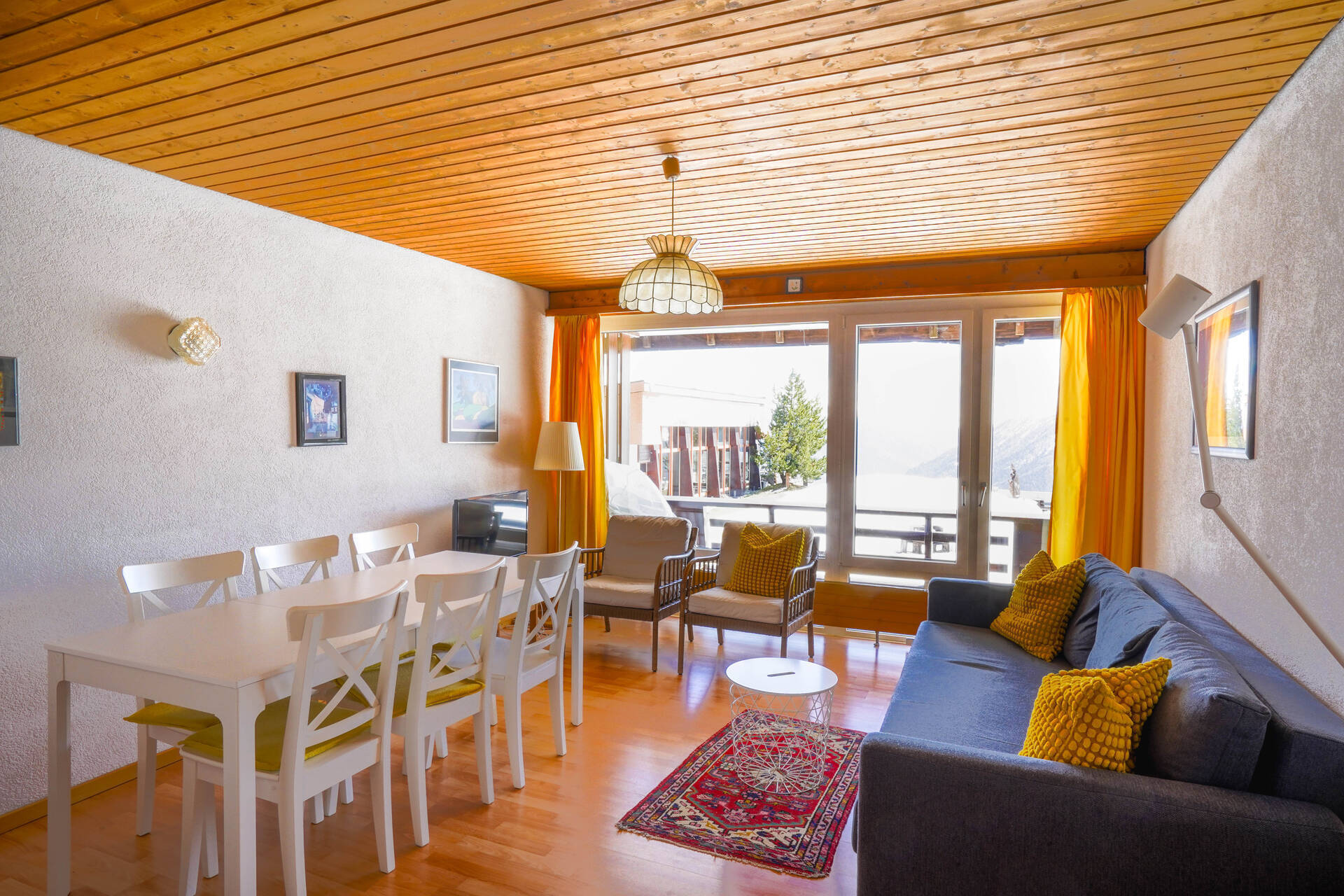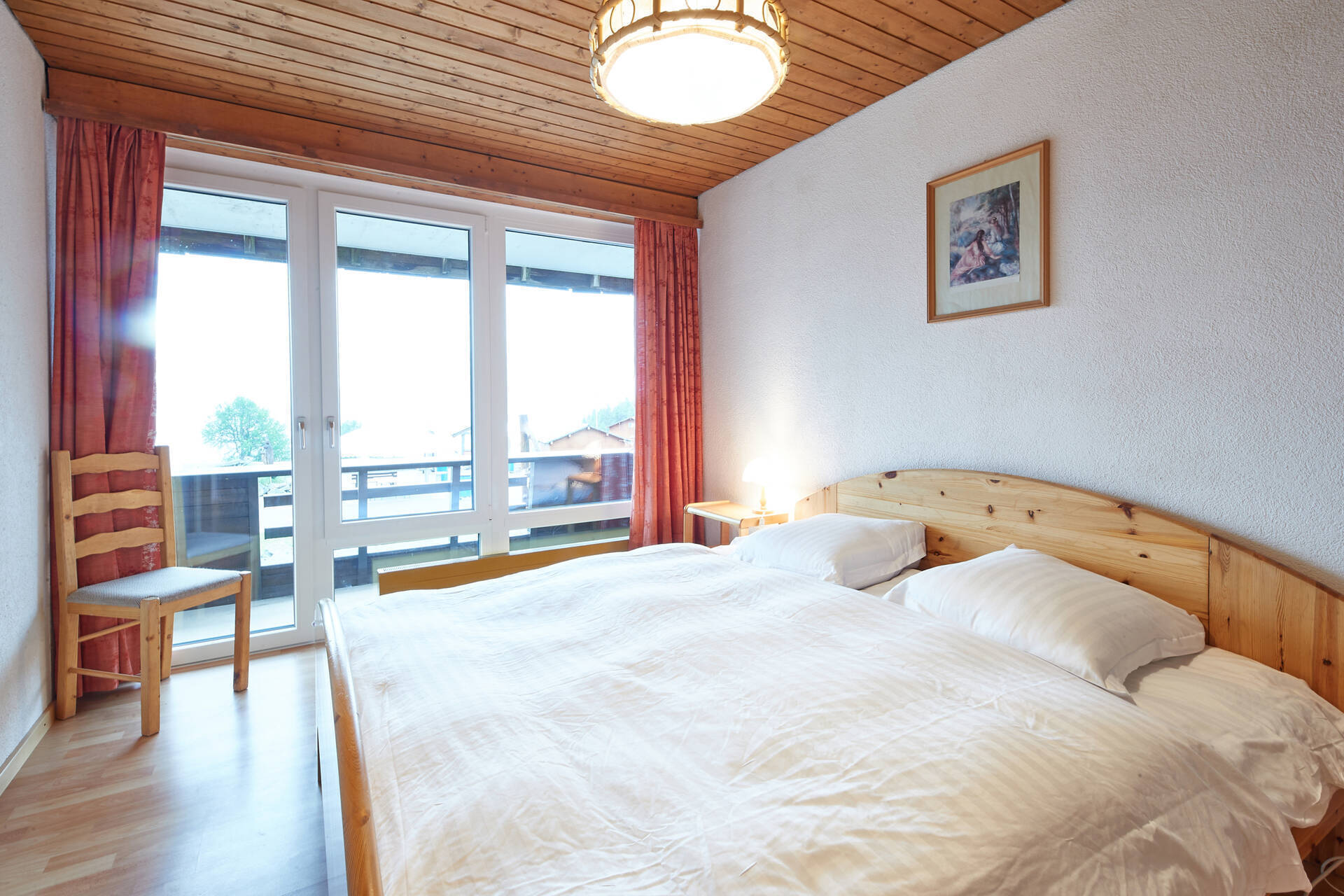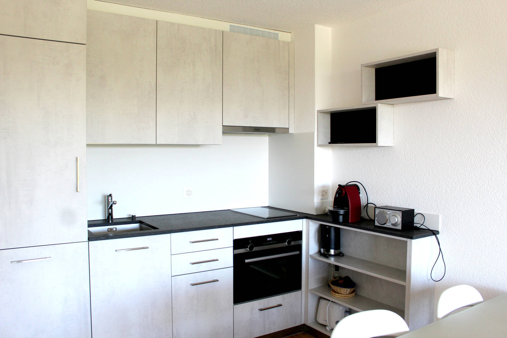 neu3-Zimmer-Wohnung (Typ L) für 5 Personen im 1. Stock des Gebäudes Flache in Thyon 2000. Sie verfügt über eine offene Küche: 4 Glaskeramikkochfelder, Backofen, Geschirrspüler und Kühlschrank mit kleinem Gefrierfach. Das Wohnzimmer, mit TV und WIFI, besteht aus einem Sitzbereich (1 Doppelschlafsofa) und einer Essecke. Schlafzimmer mit Doppelbett (2 Matratzen 2.00 X 0.90) und Kinderzimmer auch mit Doppelbett (2 Matratzen 2.00 X 0.80). Badezimmer: WC, Waschbecken und Badewanne. Balkon in Richtung Norden mit Aussicht auf die Walliser und Berner Alpen. Wohnung MIT Teppichboden. Tiere nicht erlaubt.
