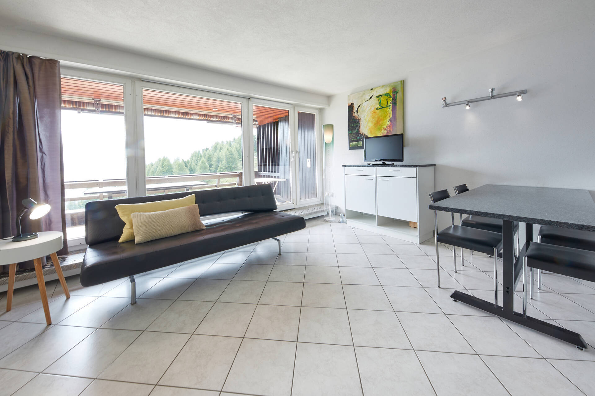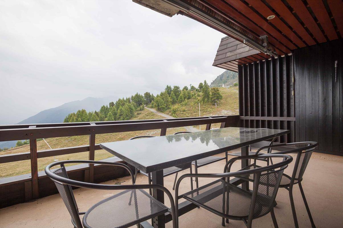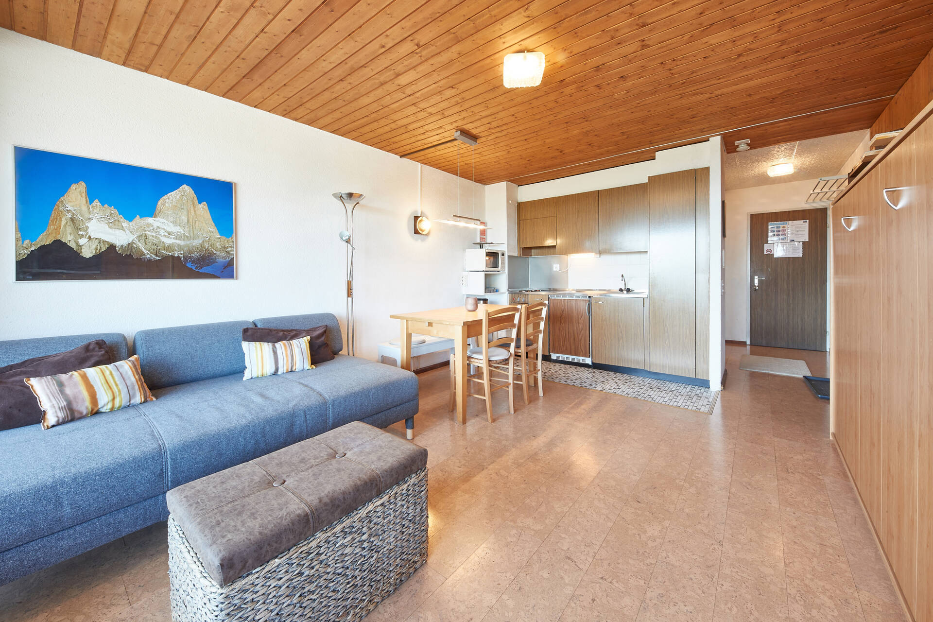 NewStudio (type E) for 3 people on the 1st floor of the building Blava (entrance A) in Thyon 2000. It has an open kitchen: 2 ceramic hobs, oven and fridge (with a small freezer). The living room, with TV and DVD, is composed of a lounge (one single sofa bed 2.00 X 1.20 and two single pull-out beds side to side 2.00 X 0.90) and a dining area. Bathroom: WC, sink and shower. Eastside balcony with view on the Val d'Hérens. Apartment WITHOUT carpet. Pets not allowed.