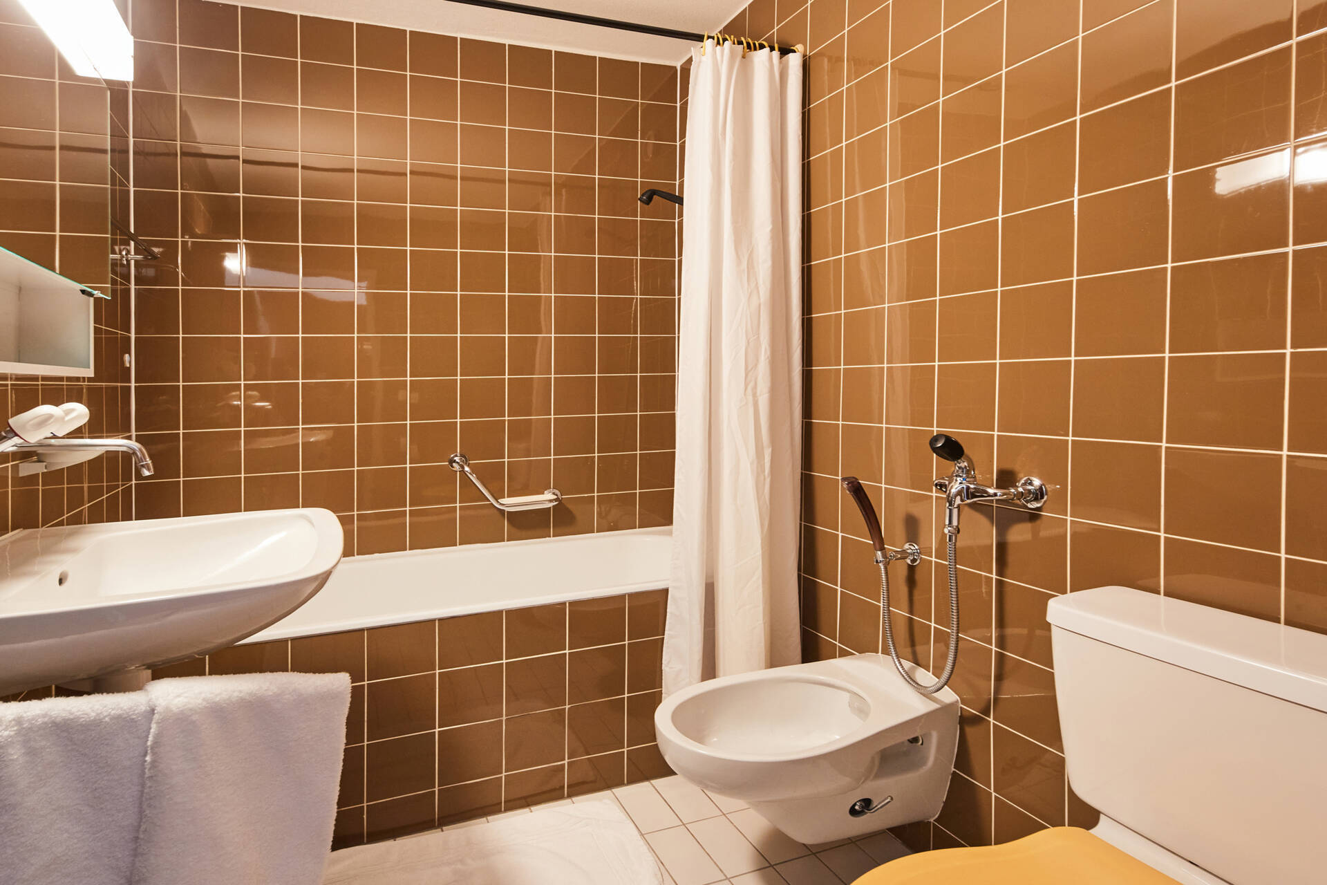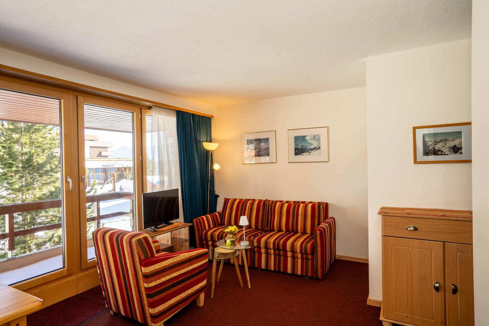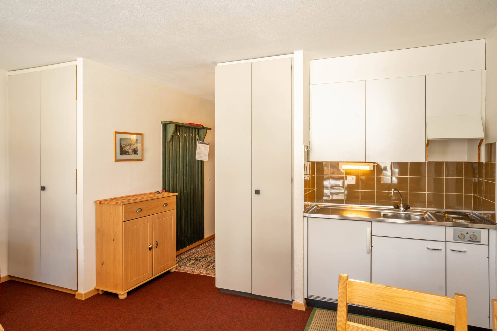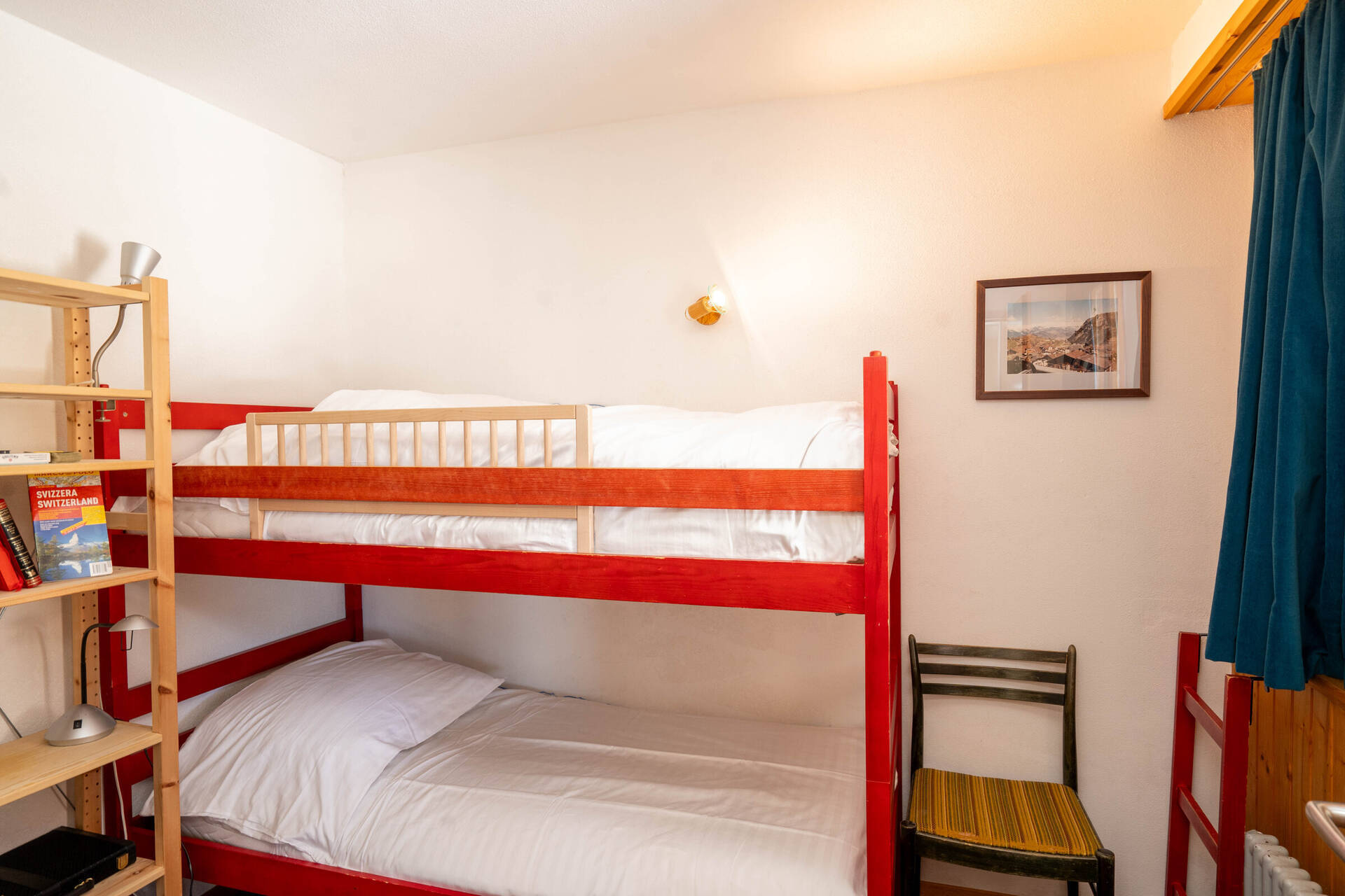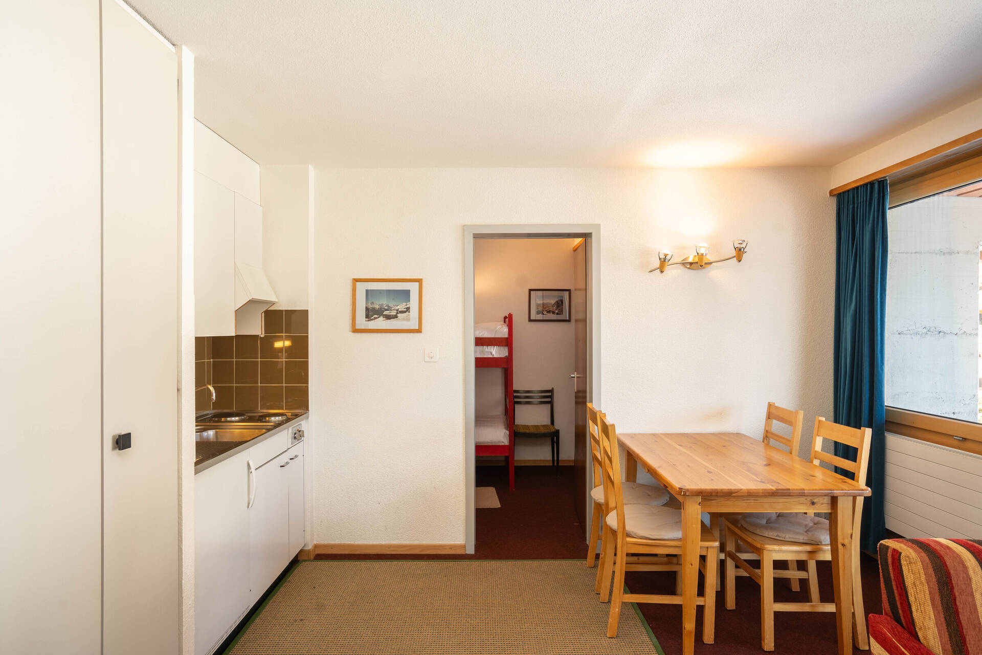 New2-rooms apartment (type D) for 4 people on the 1st floor of the building Arzinol (entrance 3) in Thyon 2000. It has an open kitchen: 2 electric hobs, fridge (with a small freezer). The living room, with TV and WIFI, is composed of a lounge (1 armchair and 1 double bed sofa) and a dining area. Children room with a bunk bed (1.90 X 0.90). Bathroom: WC, sink and bath. North-eastside balcony with view on the main square of Thyon 2000. Apartment WITH carpet. Pets not allowed.