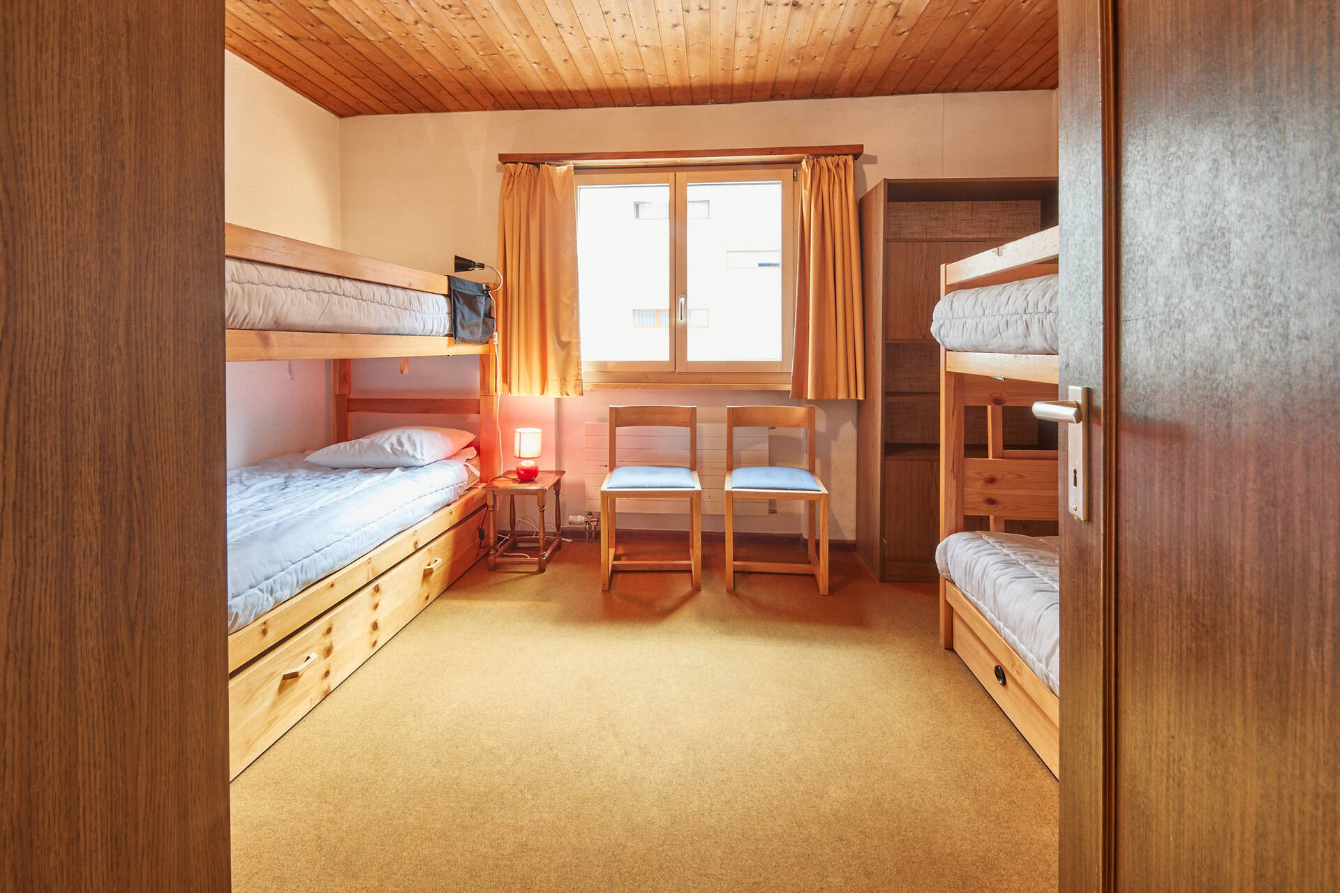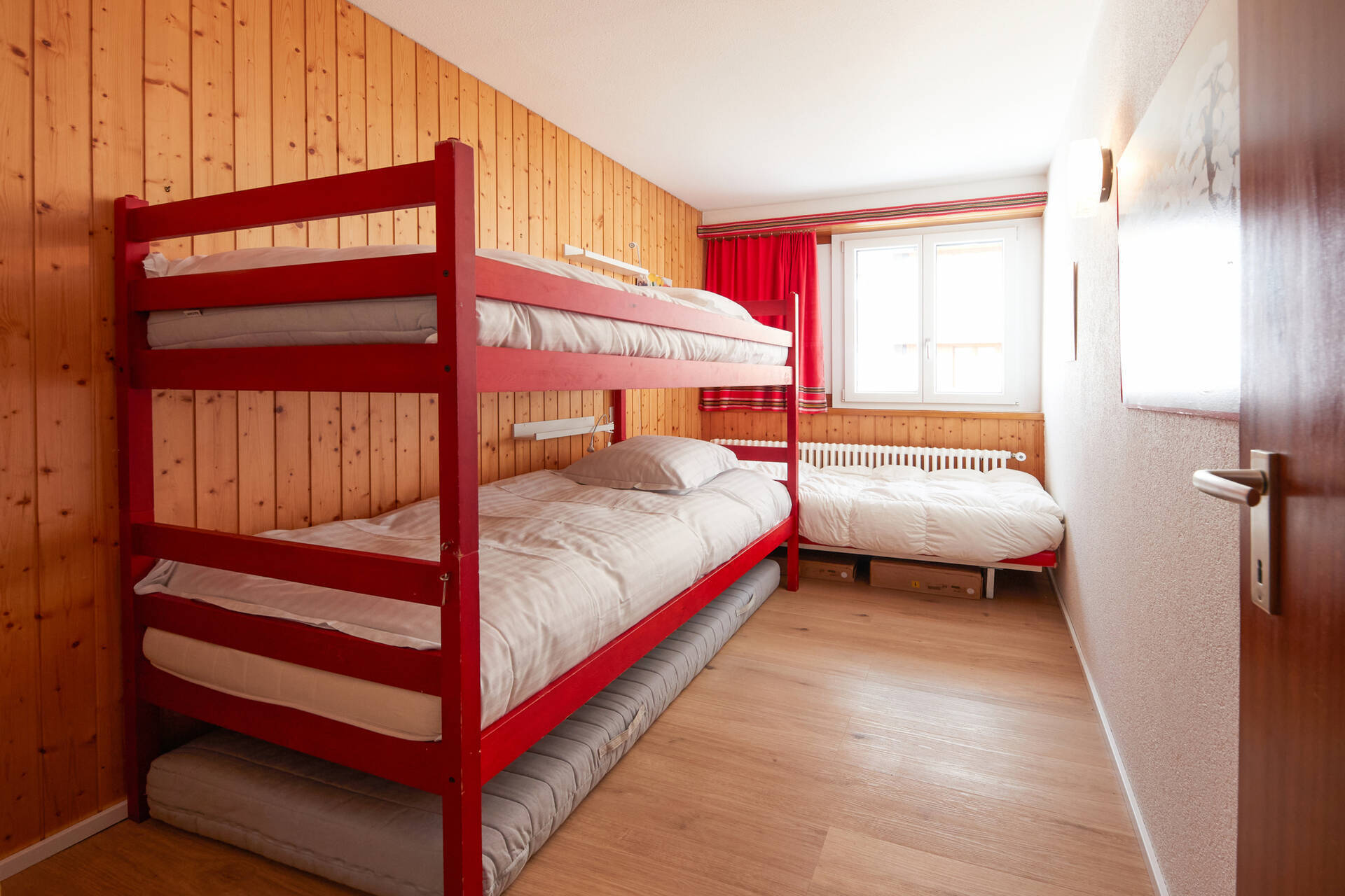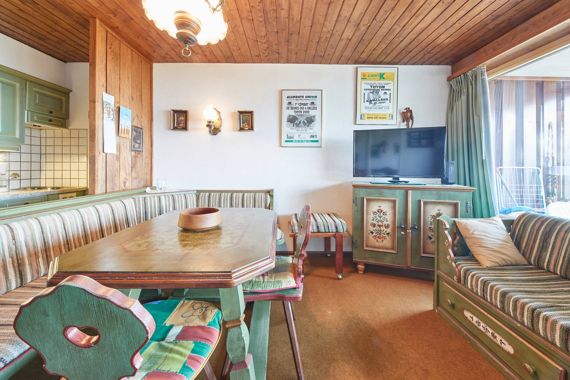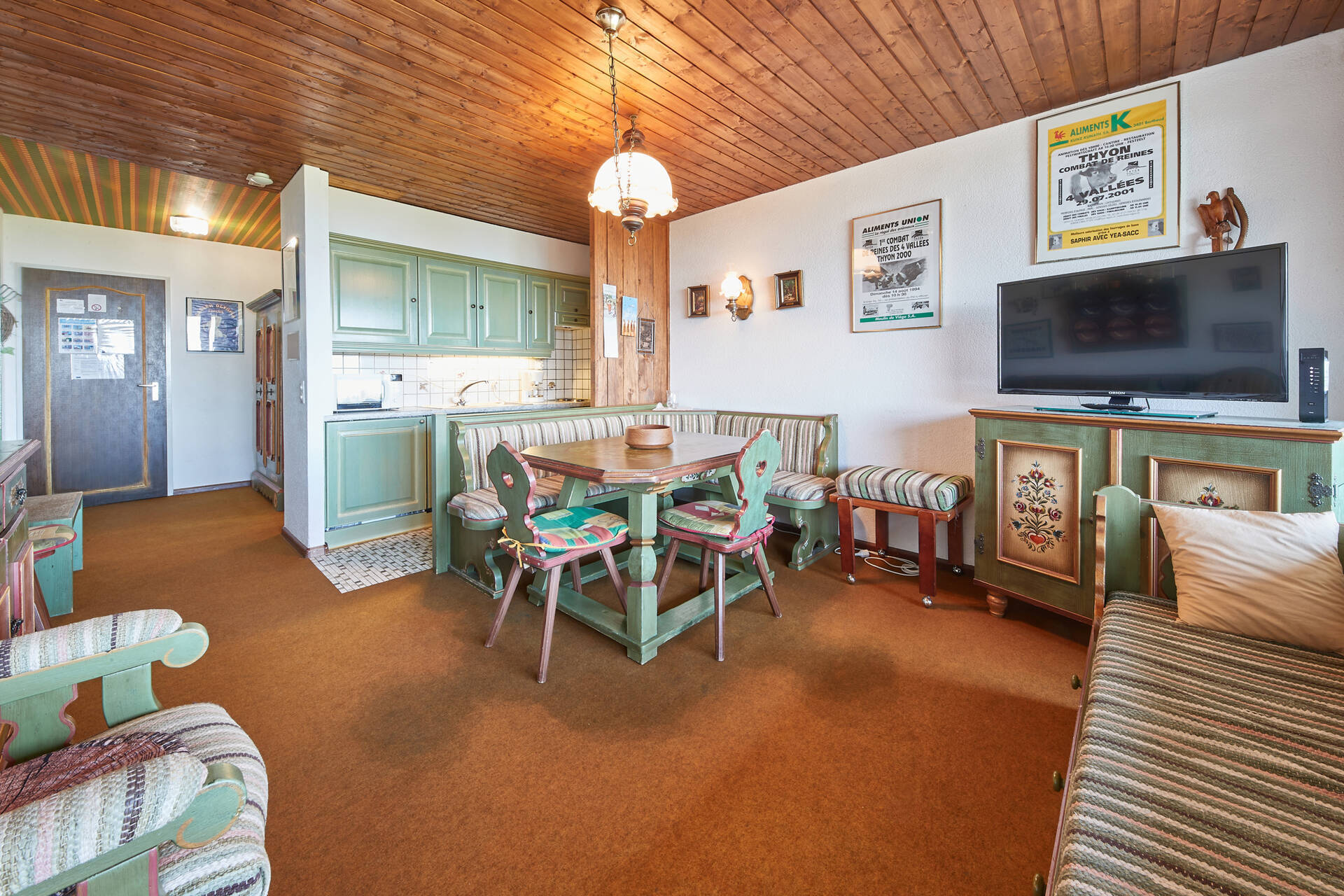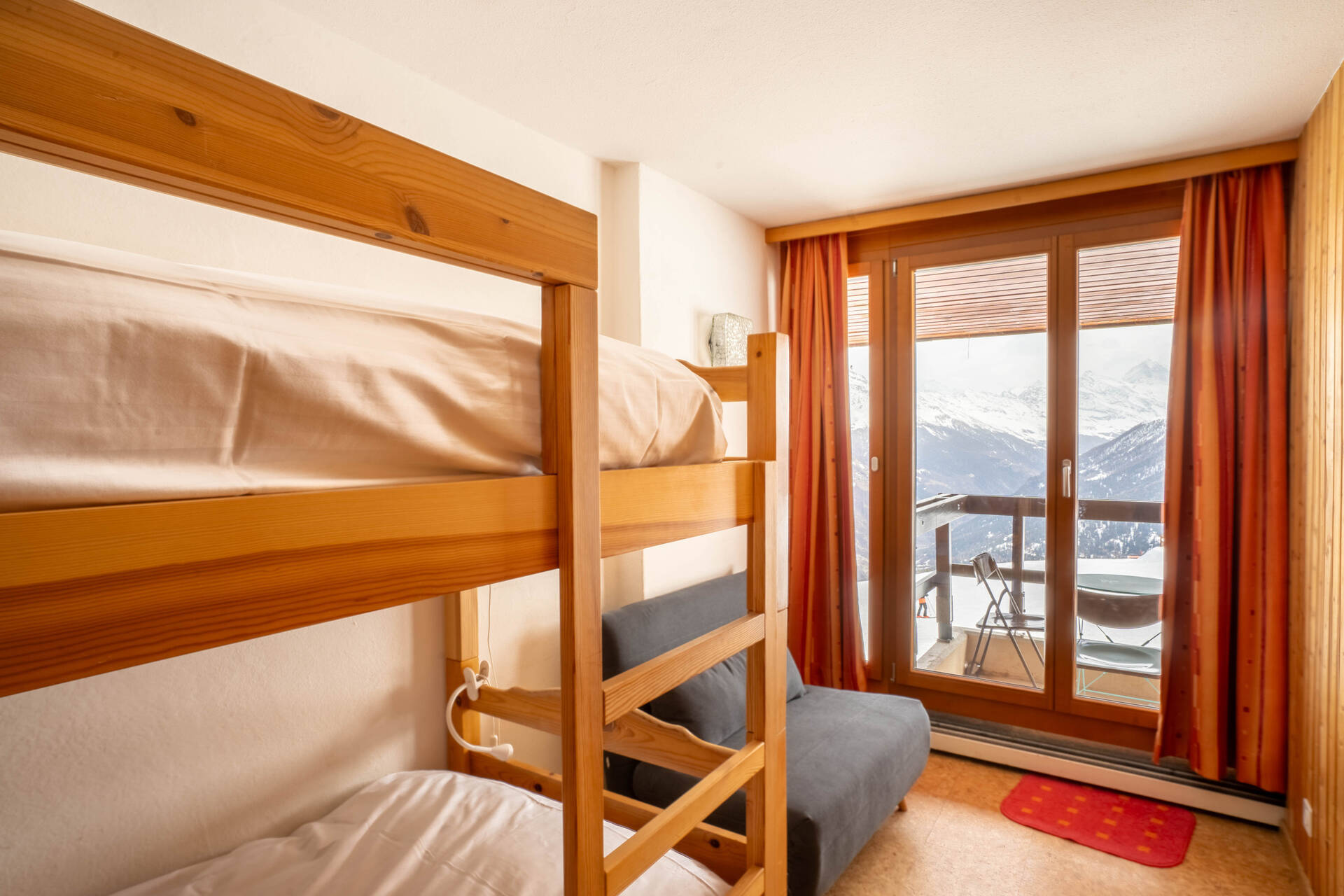 New2.5-rooms apartment (type I) for 4 people on the 4th floor of the building Rawyl in Thyon 2000. It has an open kitchen: 4 ceramic hobs, oven, dishwasher and fridge (with a small freezer). The living room, with TV and WIFI, is composed of a lounge (2 sofas) and a dining area. Bedroom with TV (access through the children room) with a double bed (2 mattresses 2.00 X 0.90) and children room with a bunk bed (1.90 X 0.80). Bathroom: WC, sink and bath. Eastside balcony with view on the main square of Thyon 2000 and the Val d'Hérens. Apartment WITHOUT carpet. Pets not allowed.