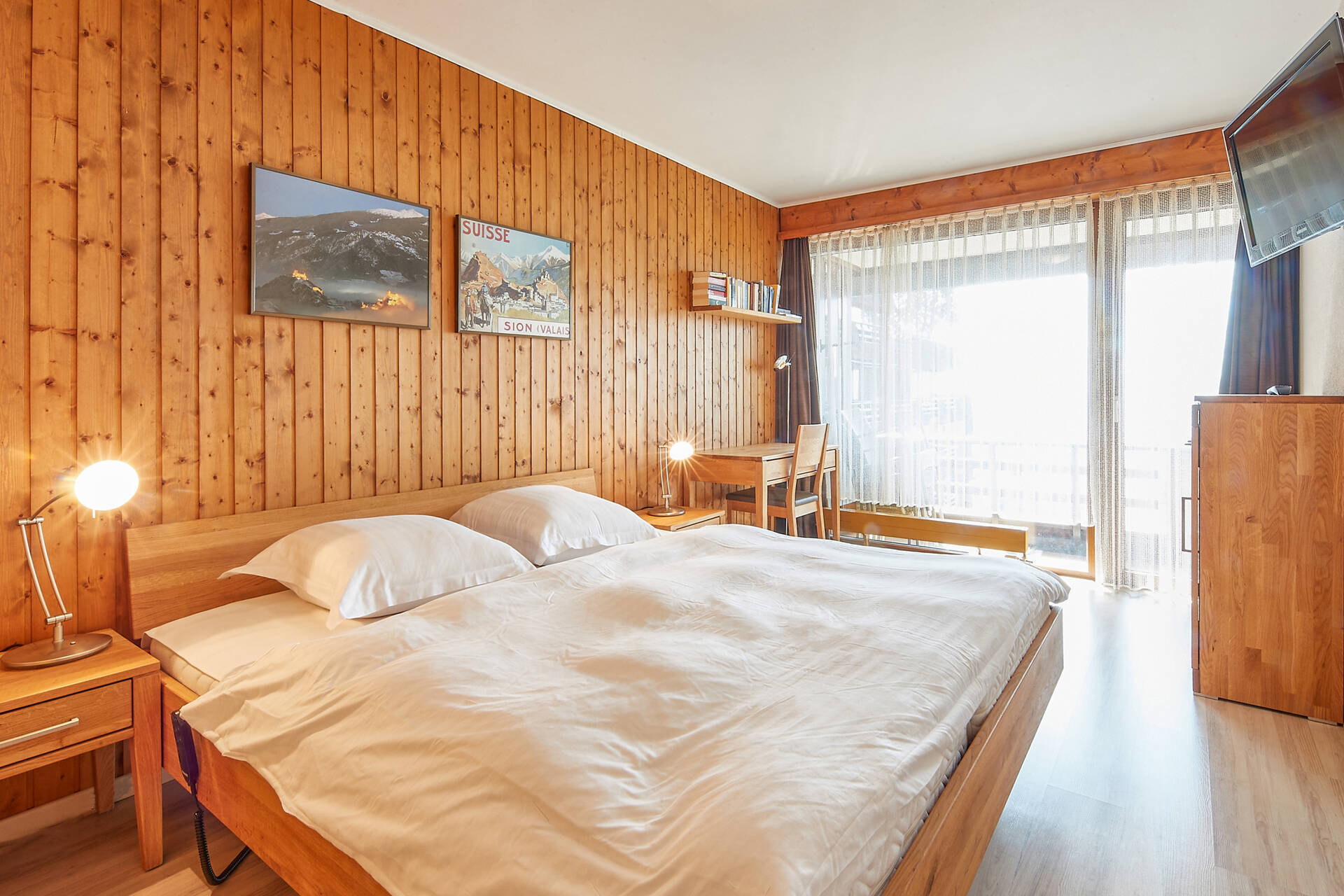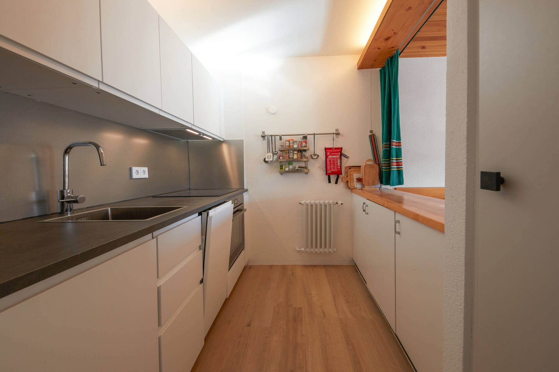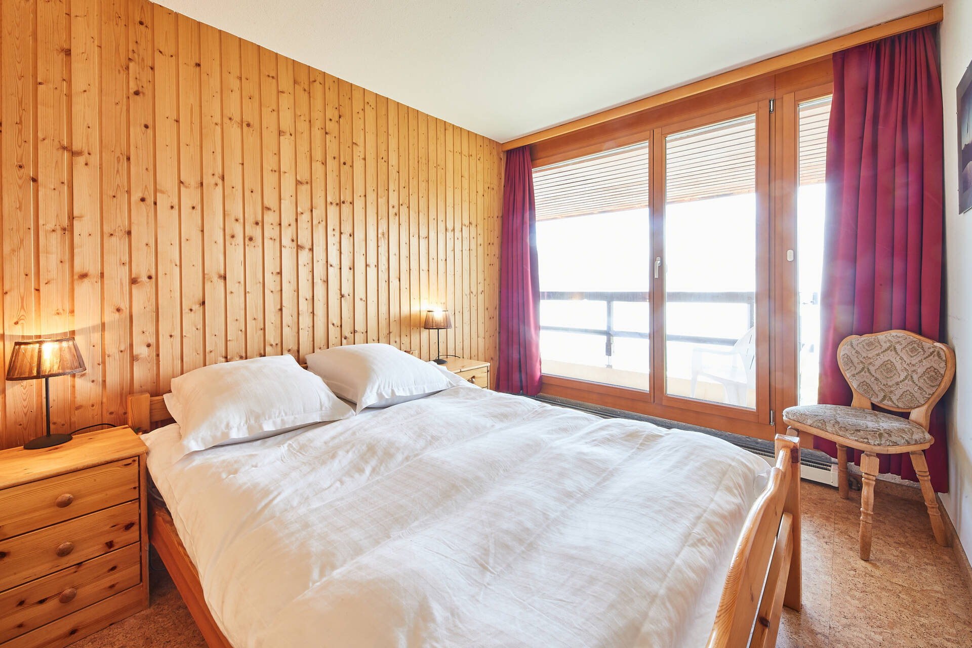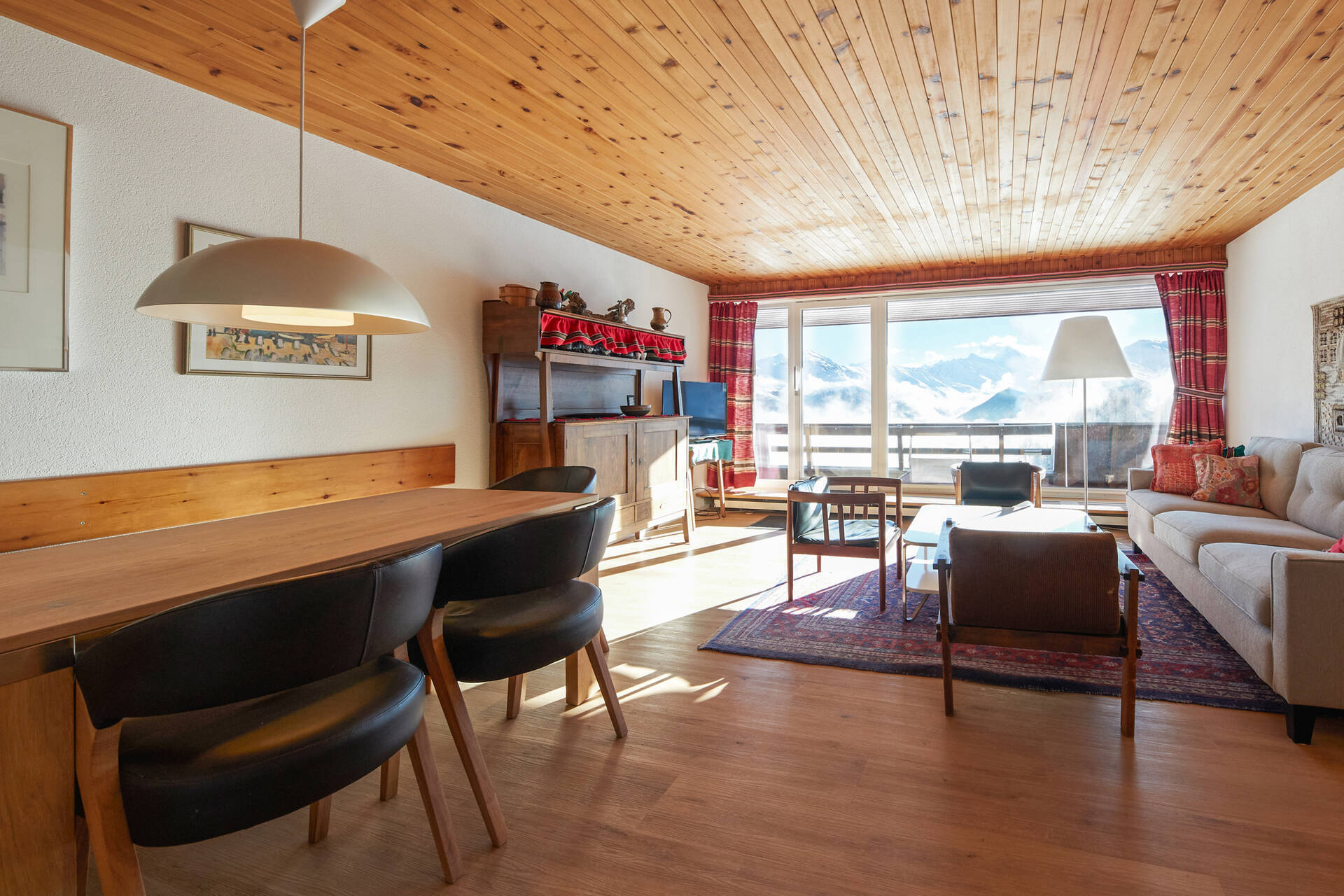 New2.5-rooms apartment (type I) for 4 people on the 4th floor of the building Rawyl in Thyon 2000. It has an open kitchen: 4 ceramic hobs, oven, dishwasher and fridge (with a small freezer). The living room, with TV and WIFI, is composed of a lounge (2 sofas) and a dining area. Bedroom with TV (access through the children room) with a double bed (2 mattresses 2.00 X 0.90) and children room with a bunk bed (1.90 X 0.80). Bathroom: WC, sink and bath. Eastside balcony with view on the main square of Thyon 2000 and the Val d'Hérens. Apartment WITHOUT carpet. Pets not allowed.