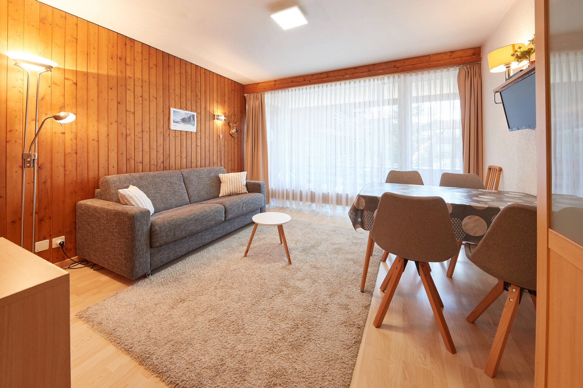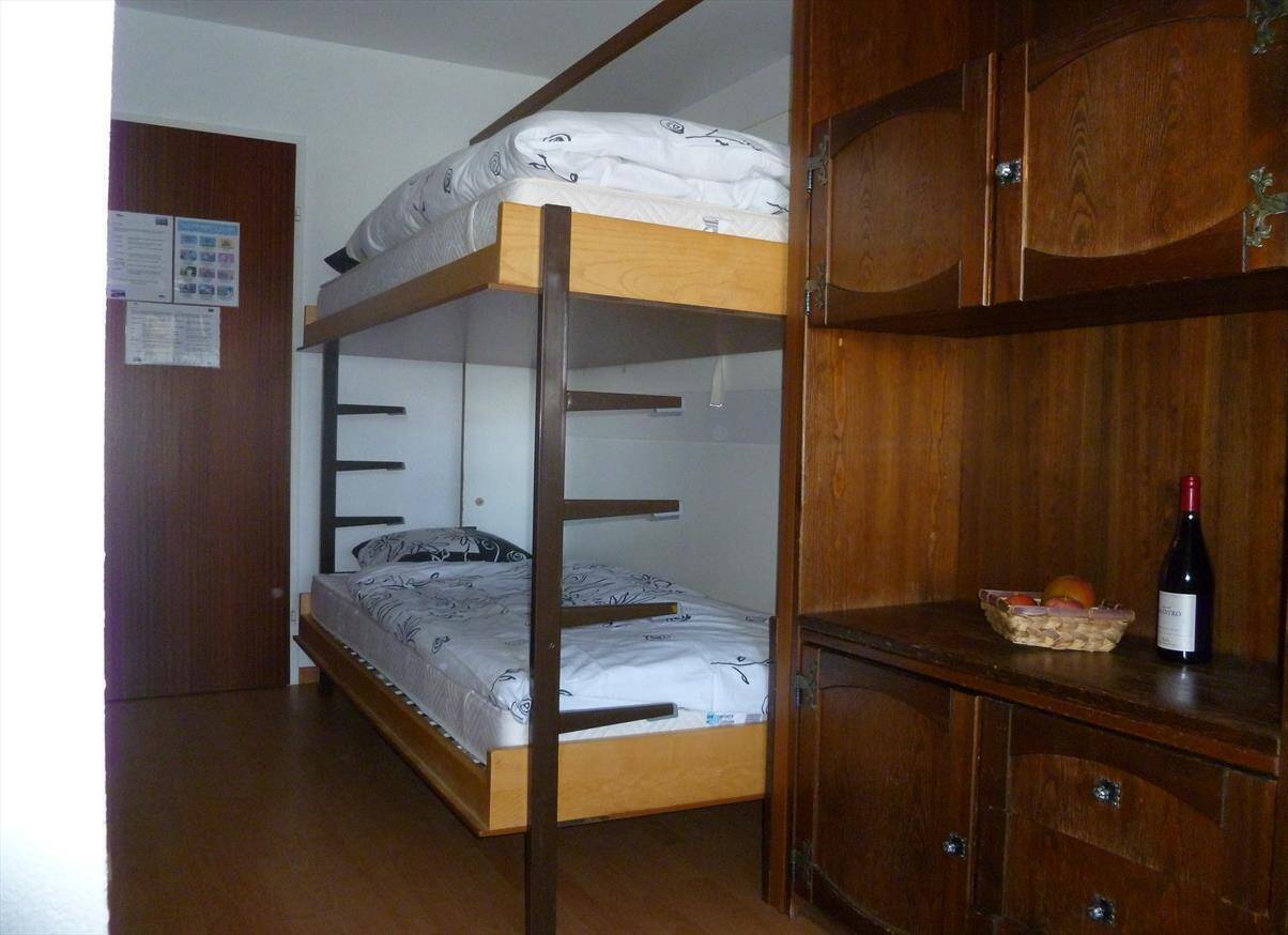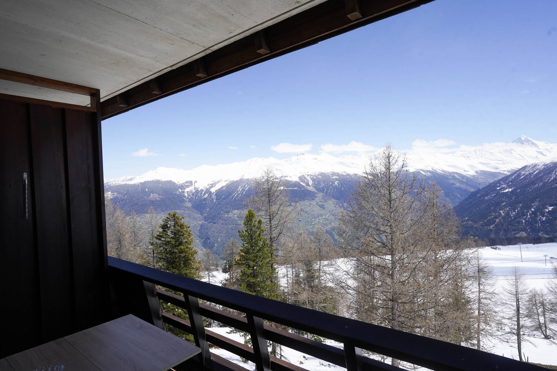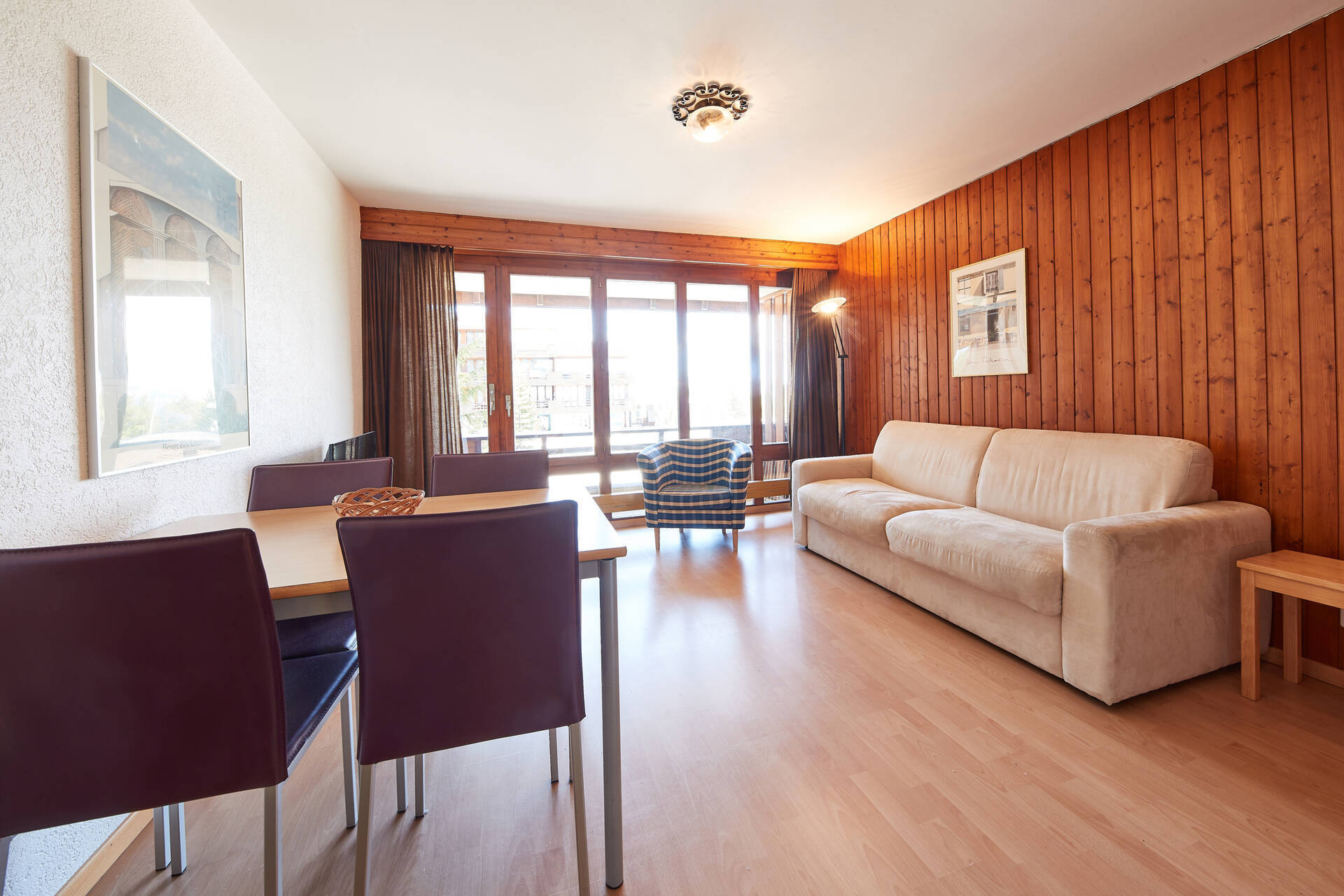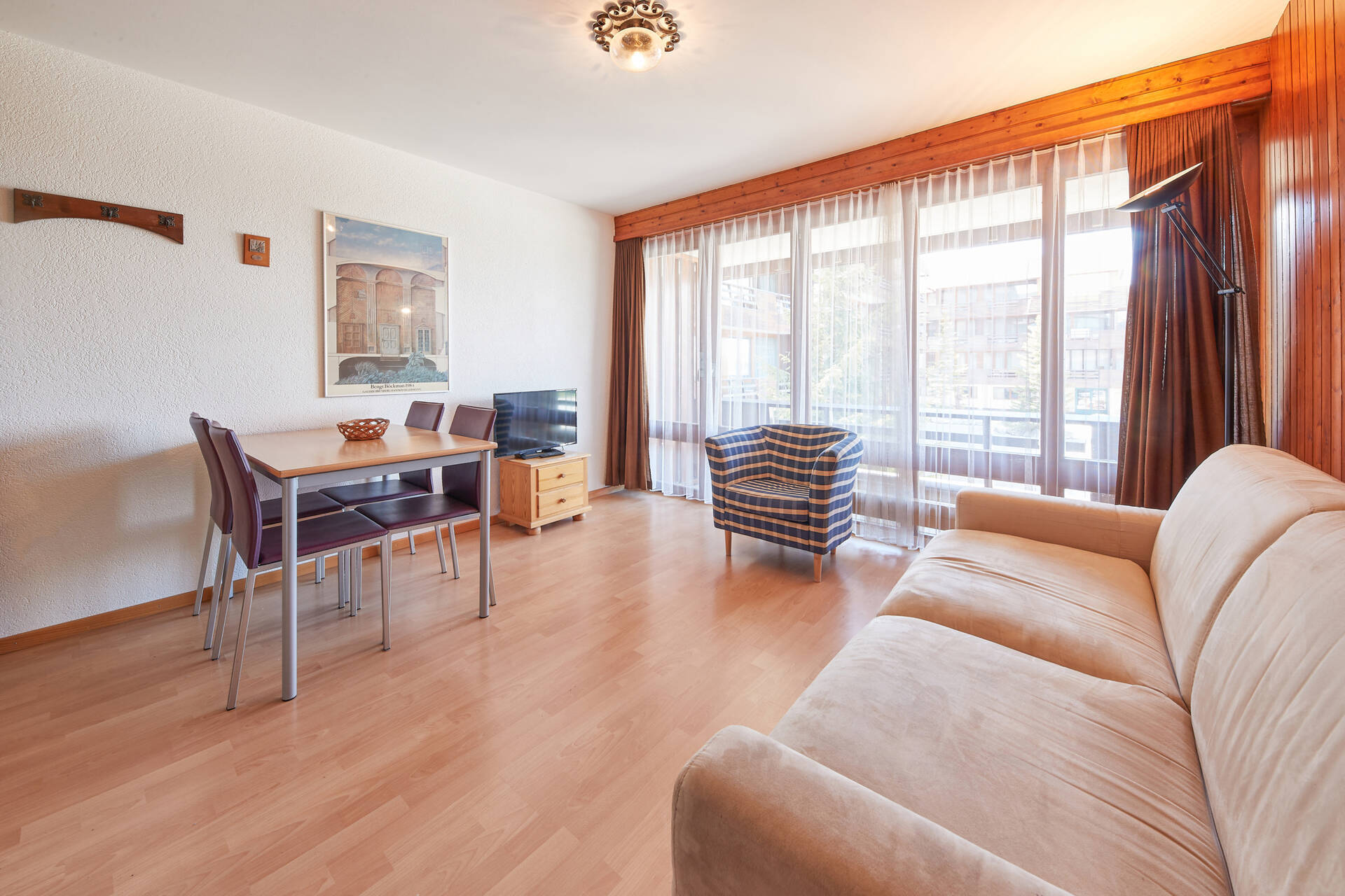 Studio (type E) for 4 people on the 1st floor of the building Greppon in Thyon 2000. It has an open kitchen: 2 ceramic hobs, microwave, dishwasher and fride (with a small freezer). The living room, with TV, is composed of a lounge (1 double sofa bed 1.90 X 1.40 and 1 fold out bunk bed 1.90 X 0.90) and a dining area. Bathroom: WC, sink and bath. Balcony with view on the Valais and Vaud Alps. Apartment WITHOUT carpet. Pets not allowed.