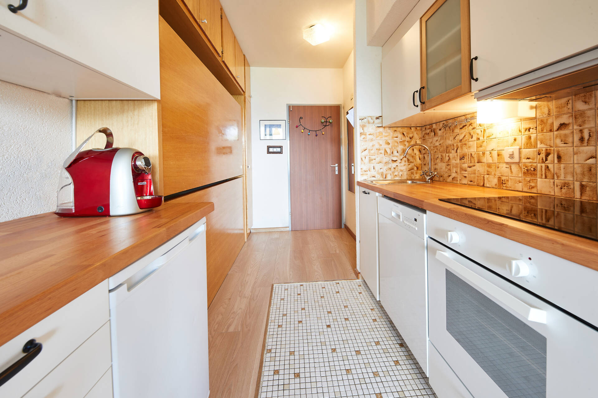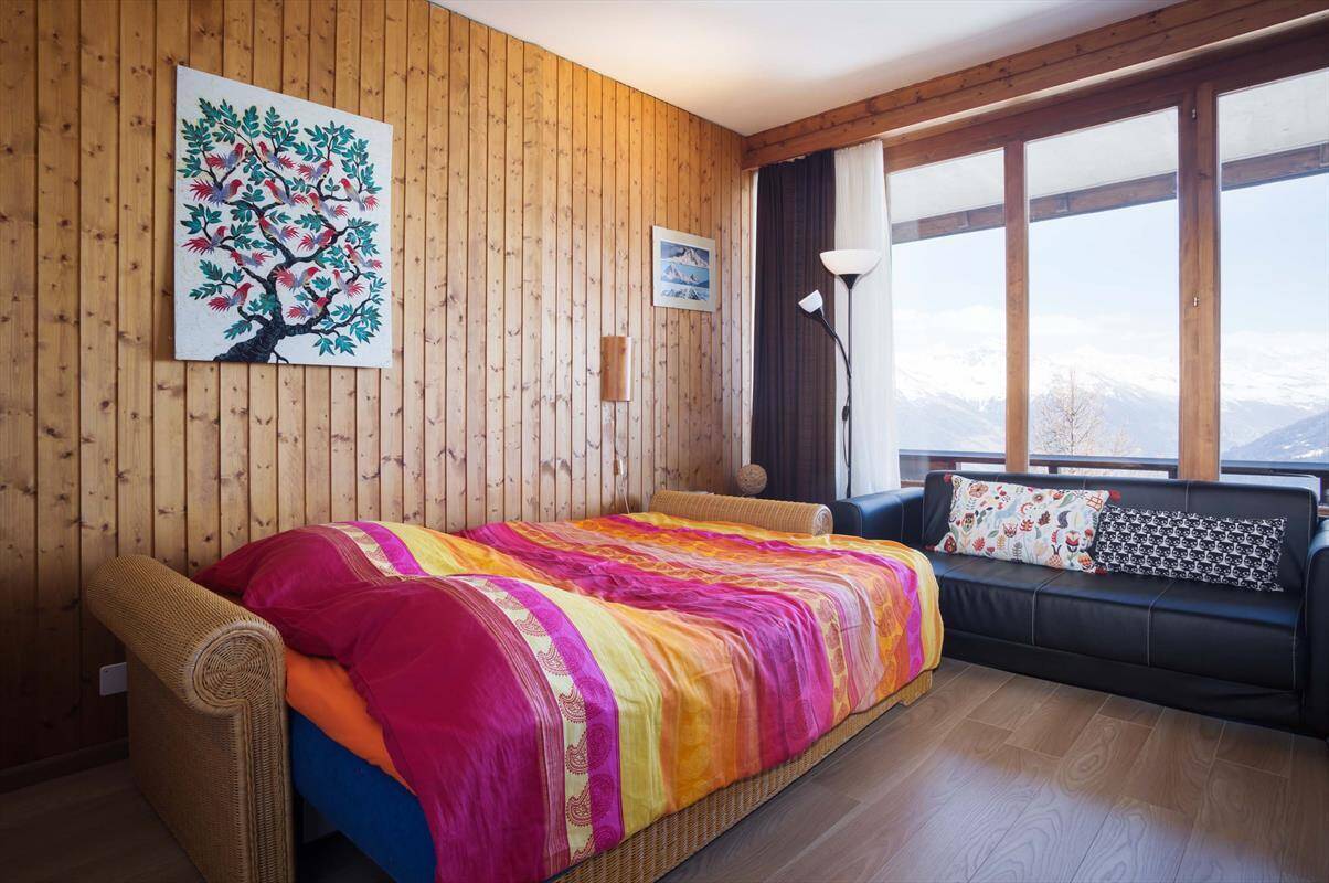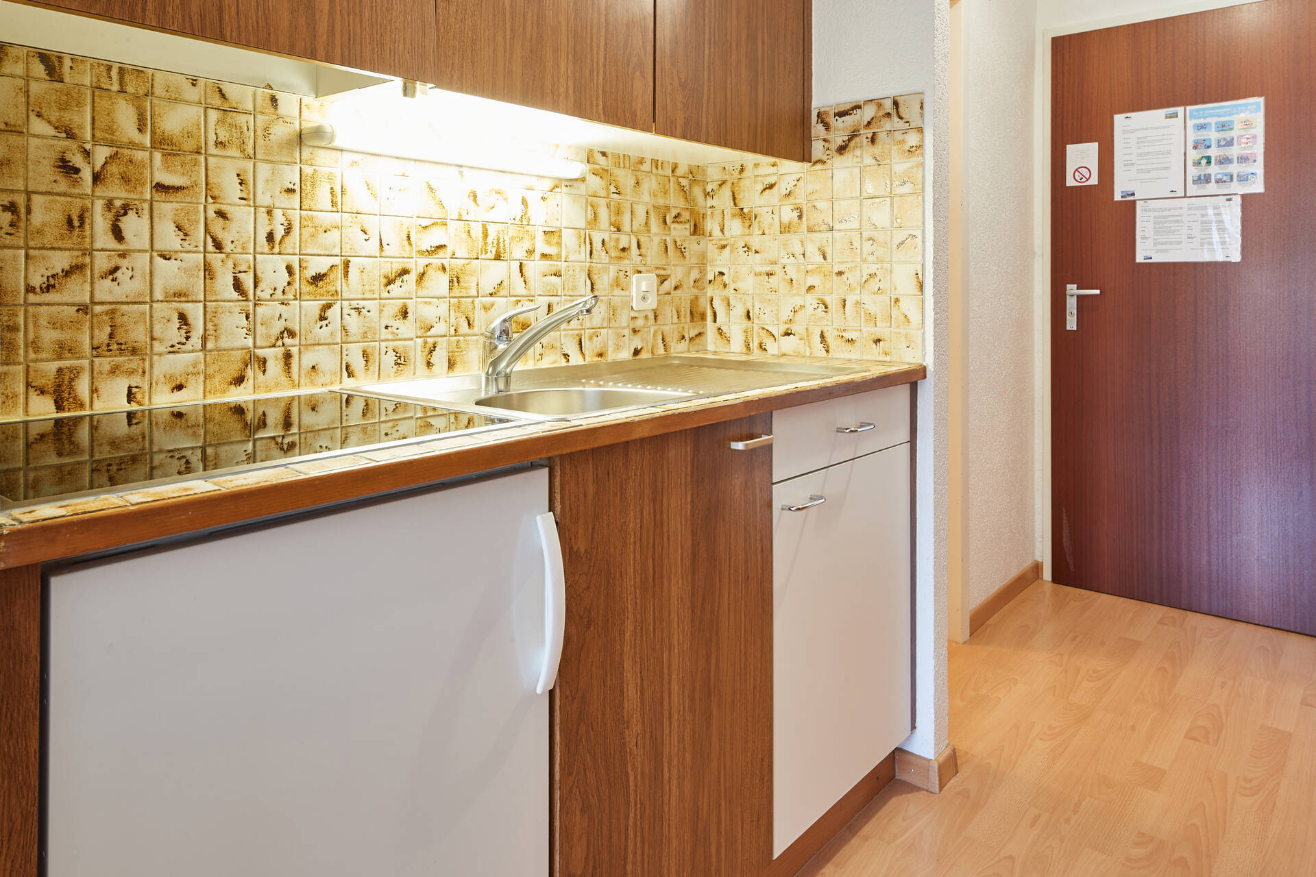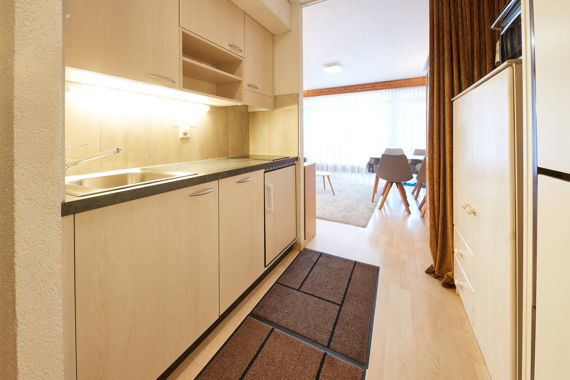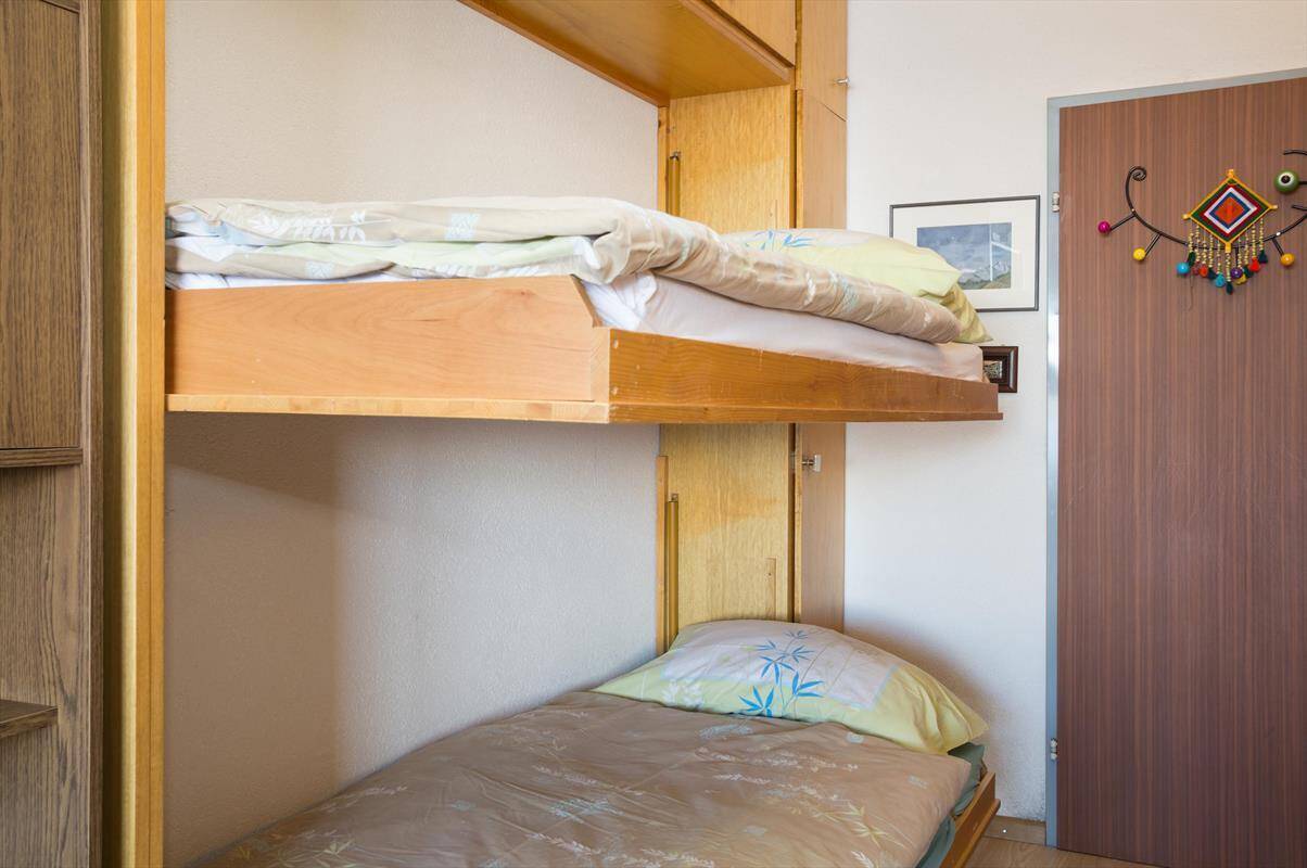 Studio (type E) for 4 people on the 1st floor of the building Greppon in Thyon 2000. It has an open kitchen: 2 ceramic hobs, microwave, dishwasher and fride (with a small freezer). The living room, with TV, is composed of a lounge (1 double sofa bed 1.90 X 1.40 and 1 fold out bunk bed 1.90 X 0.90) and a dining area. Bathroom: WC, sink and bath. Balcony with view on the Valais and Vaud Alps. Apartment WITHOUT carpet. Pets not allowed.