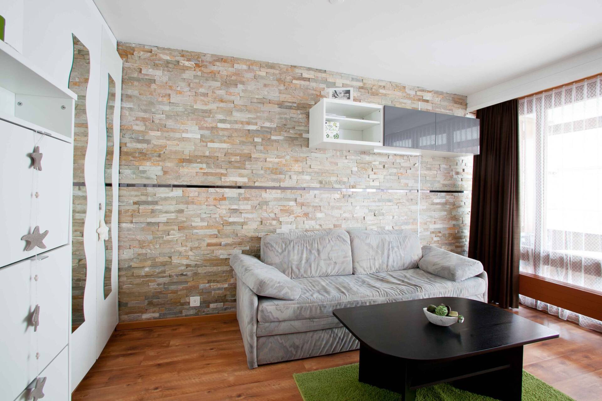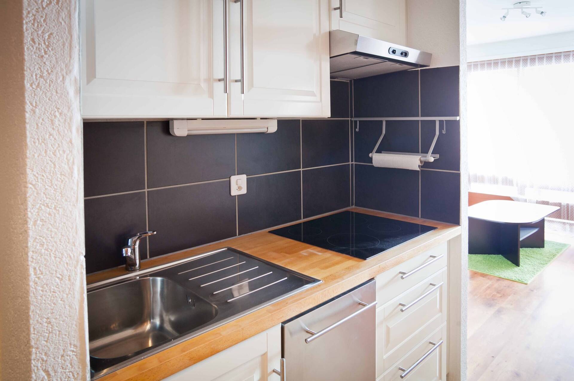 NewStudio (type D) for 4 people on the 3rd floor of the building Greppon in Thyon 2000. It has an open kitchen: 4 ceramic hobs, oven, dishwasher, fridge (with a small freezer). The living room, with TV, is composed of a lounge (one double sofa bed 2.00 X 1.40 and a fold out bunk bed 1.90 X 0.90) and a dining area. Bathroom: WC, sink and bath. Balcony with view on the main square of Thyon 2000. Apartment WITHOUT carpet. Pets allowed.