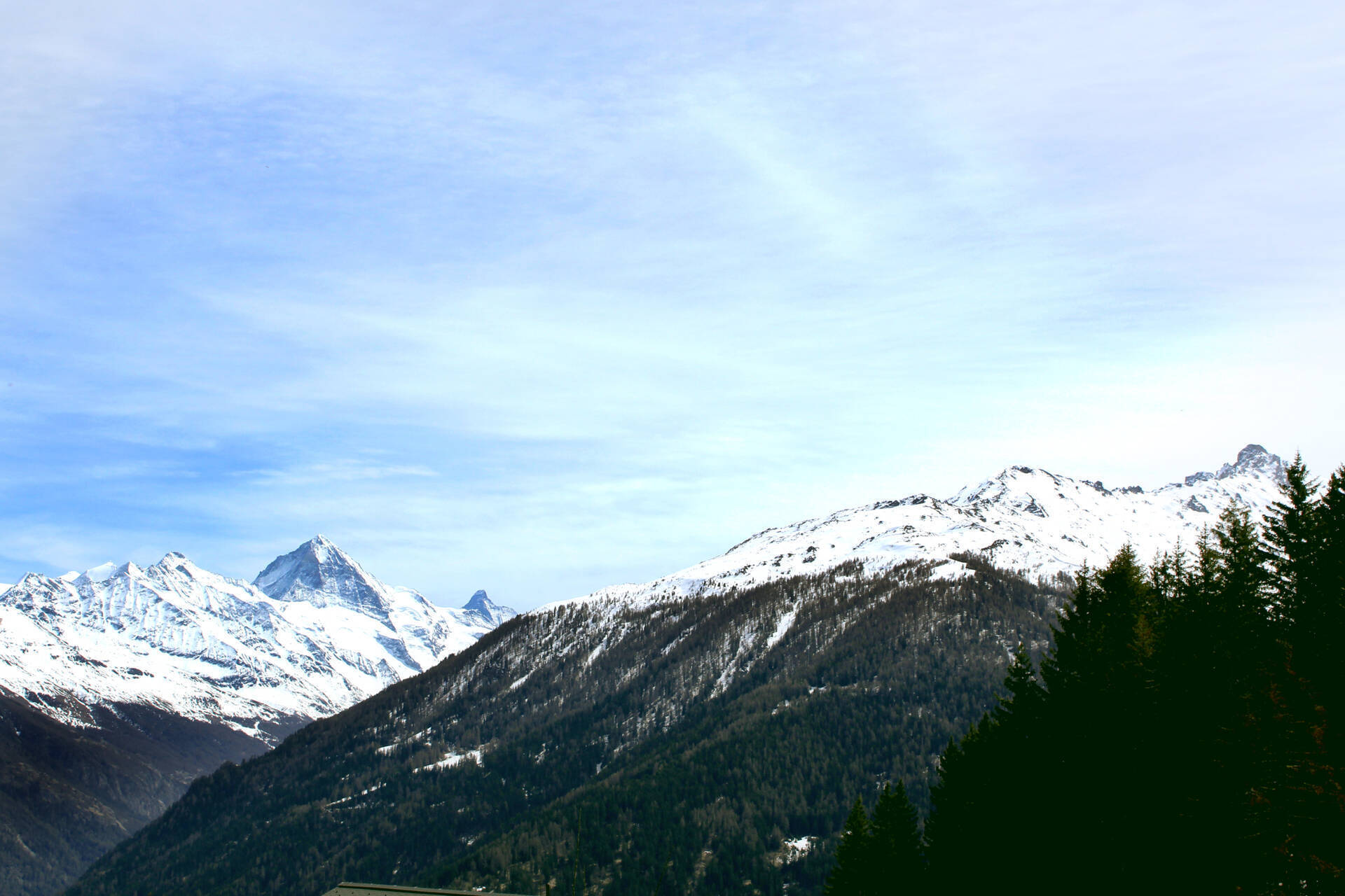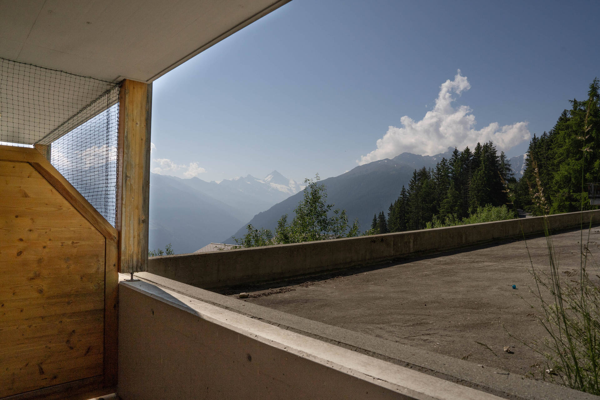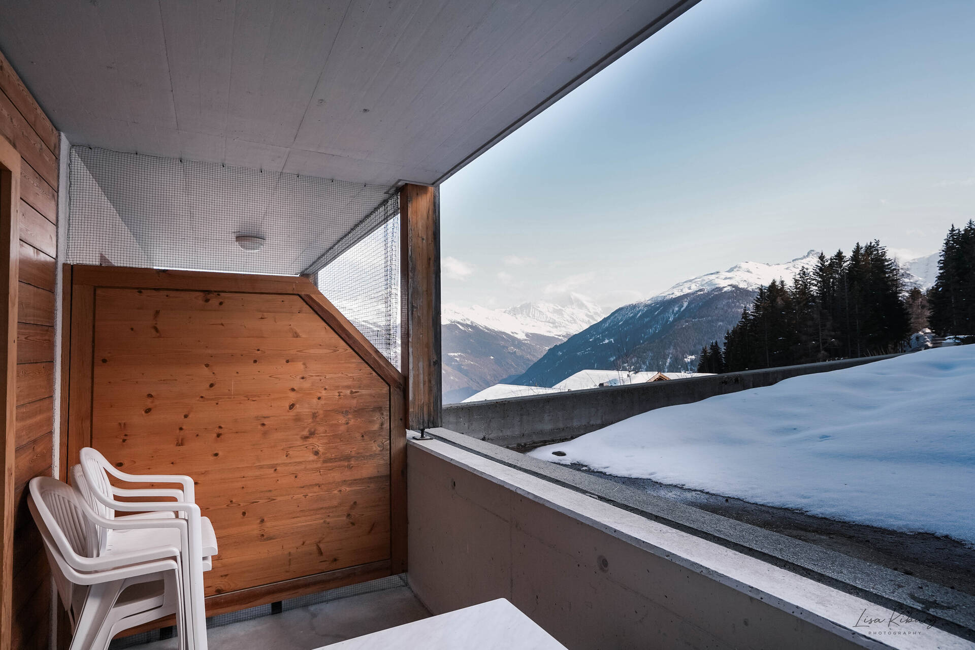 South facing balcony with garden furniture and view of the forest and the Val des Dix.