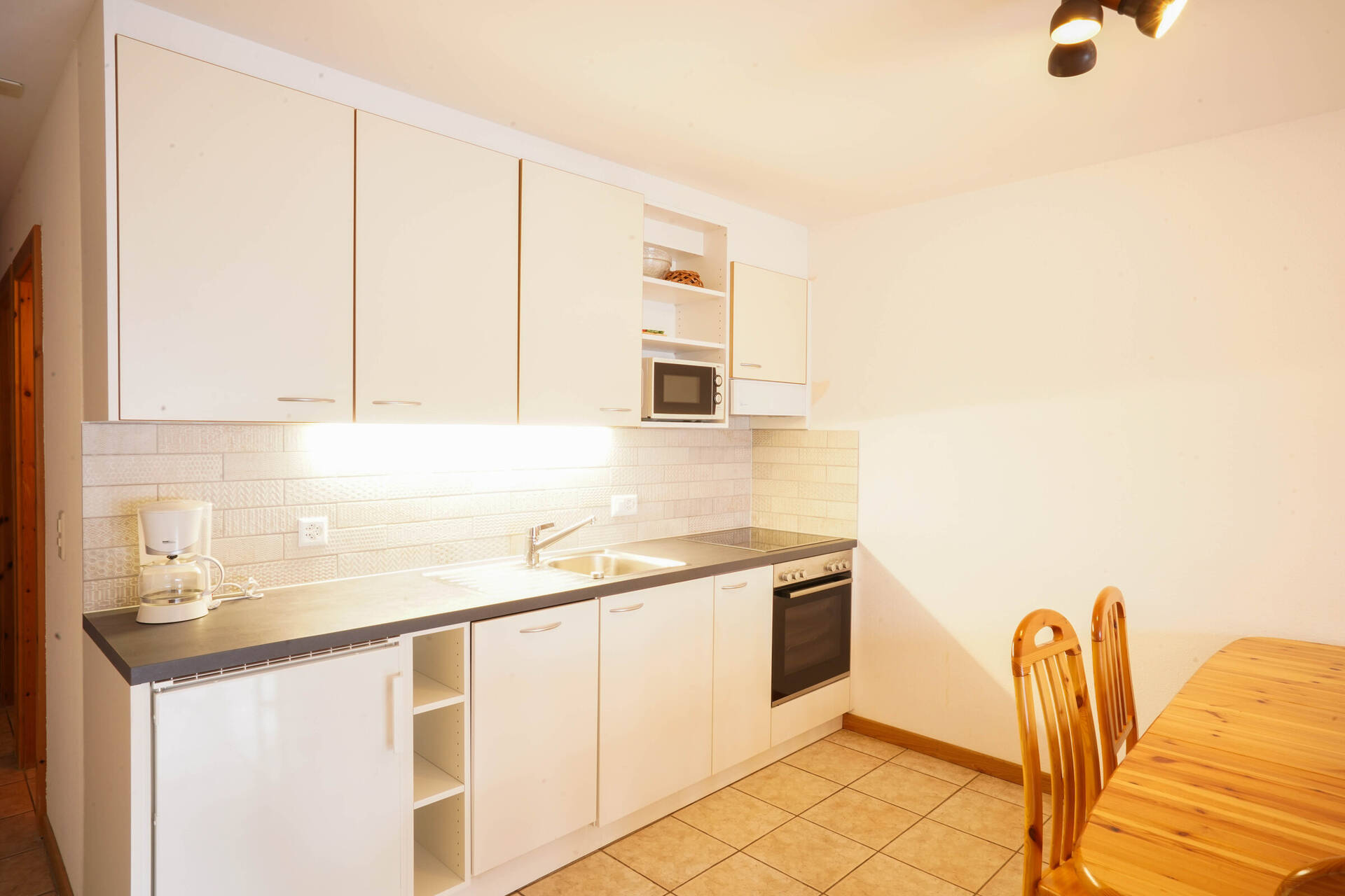 It has an open kitchen: 4 ceramic hobs, oven, large fridge (with freezer section), filter coffee machine, microwave oven, toaster, kettle, fondue pot.