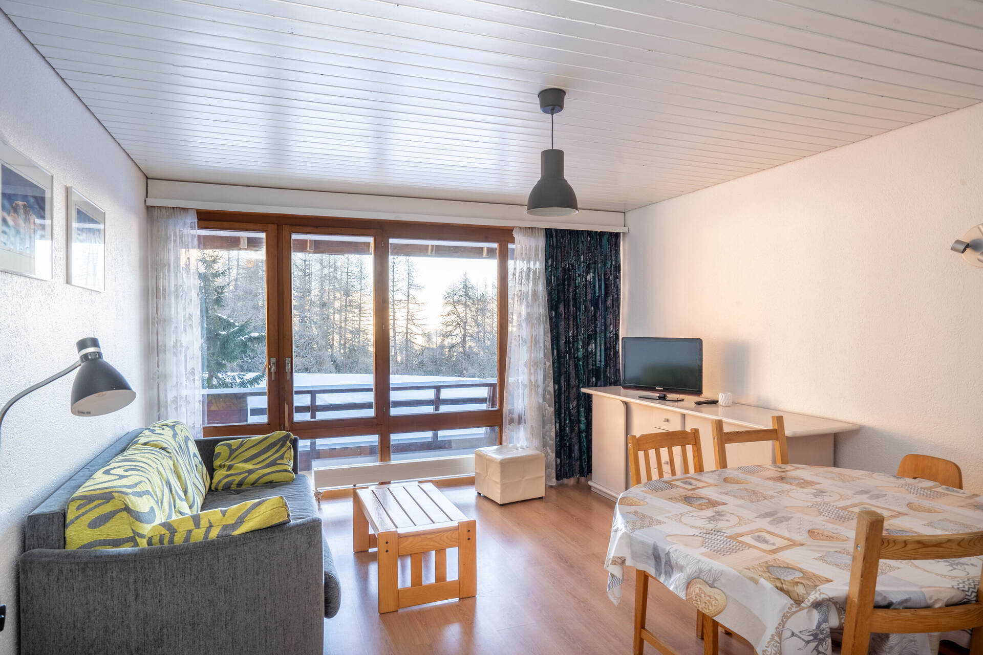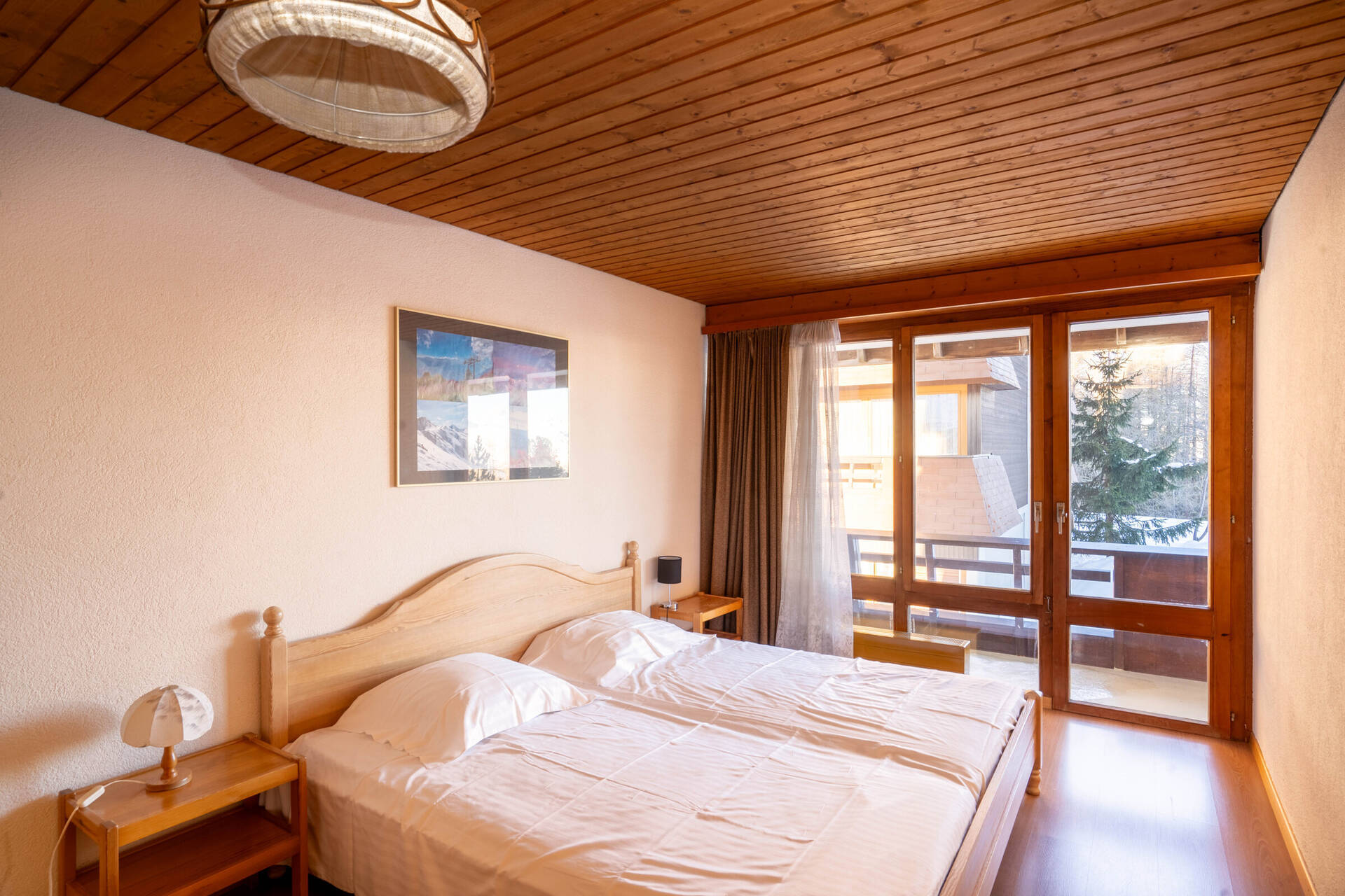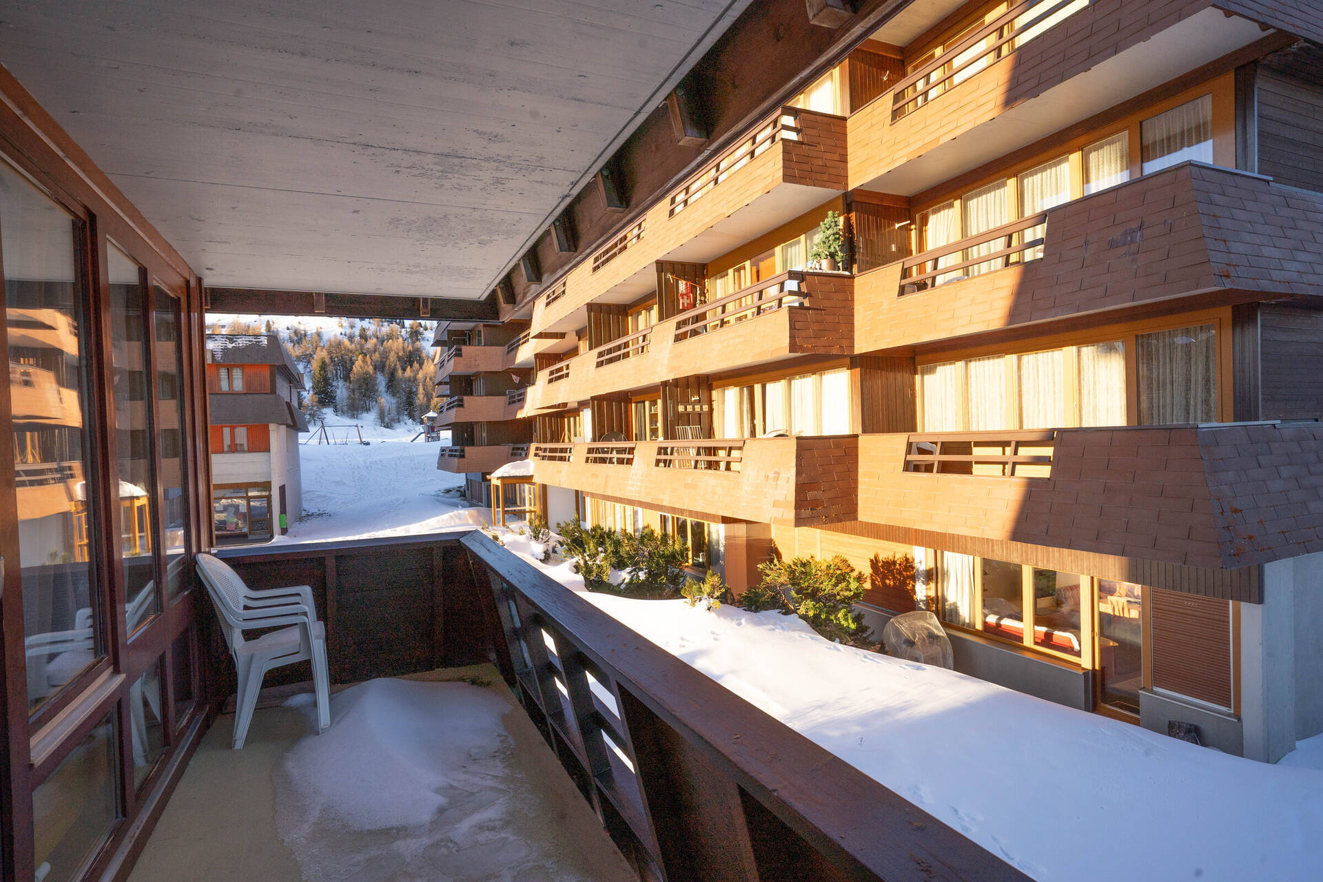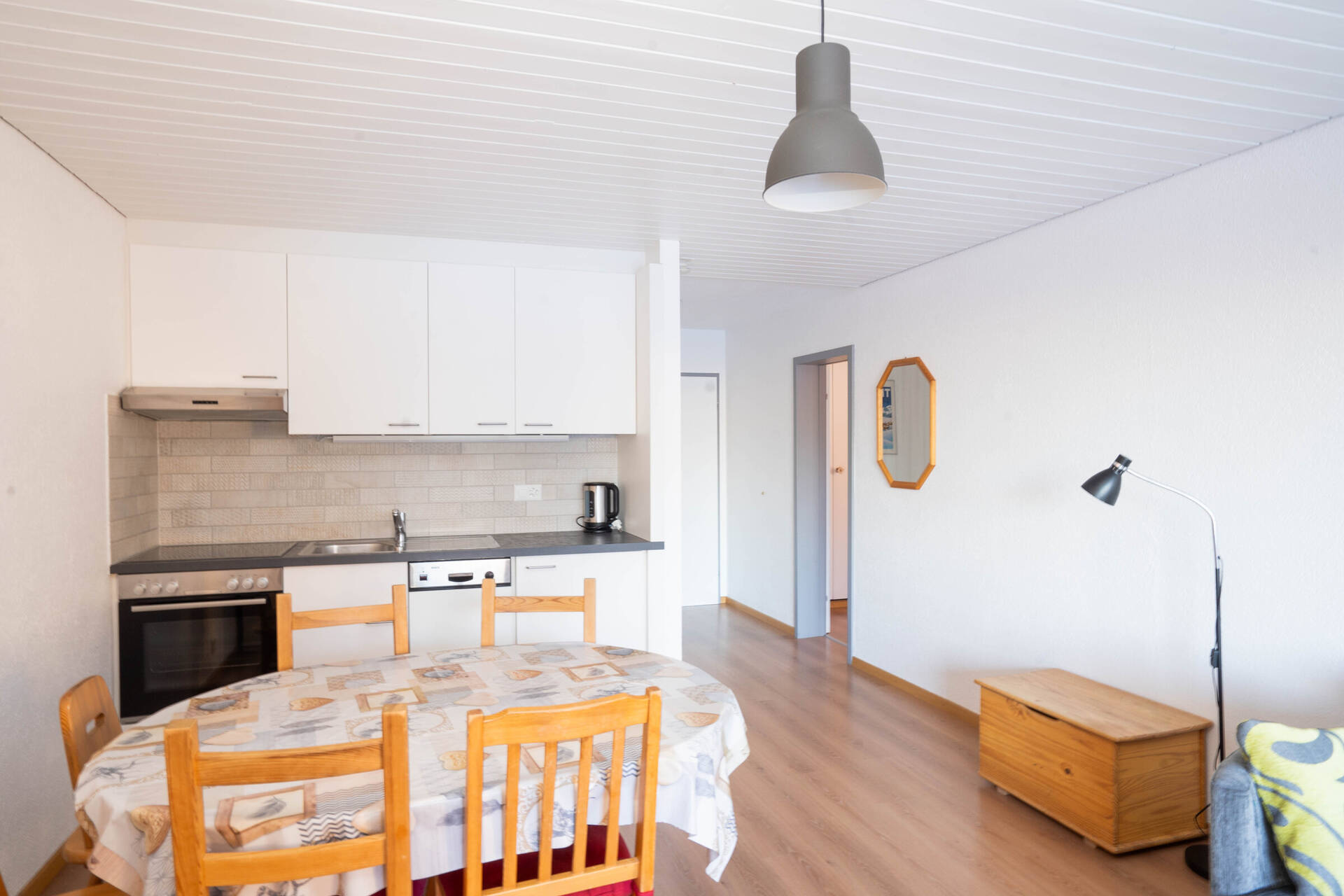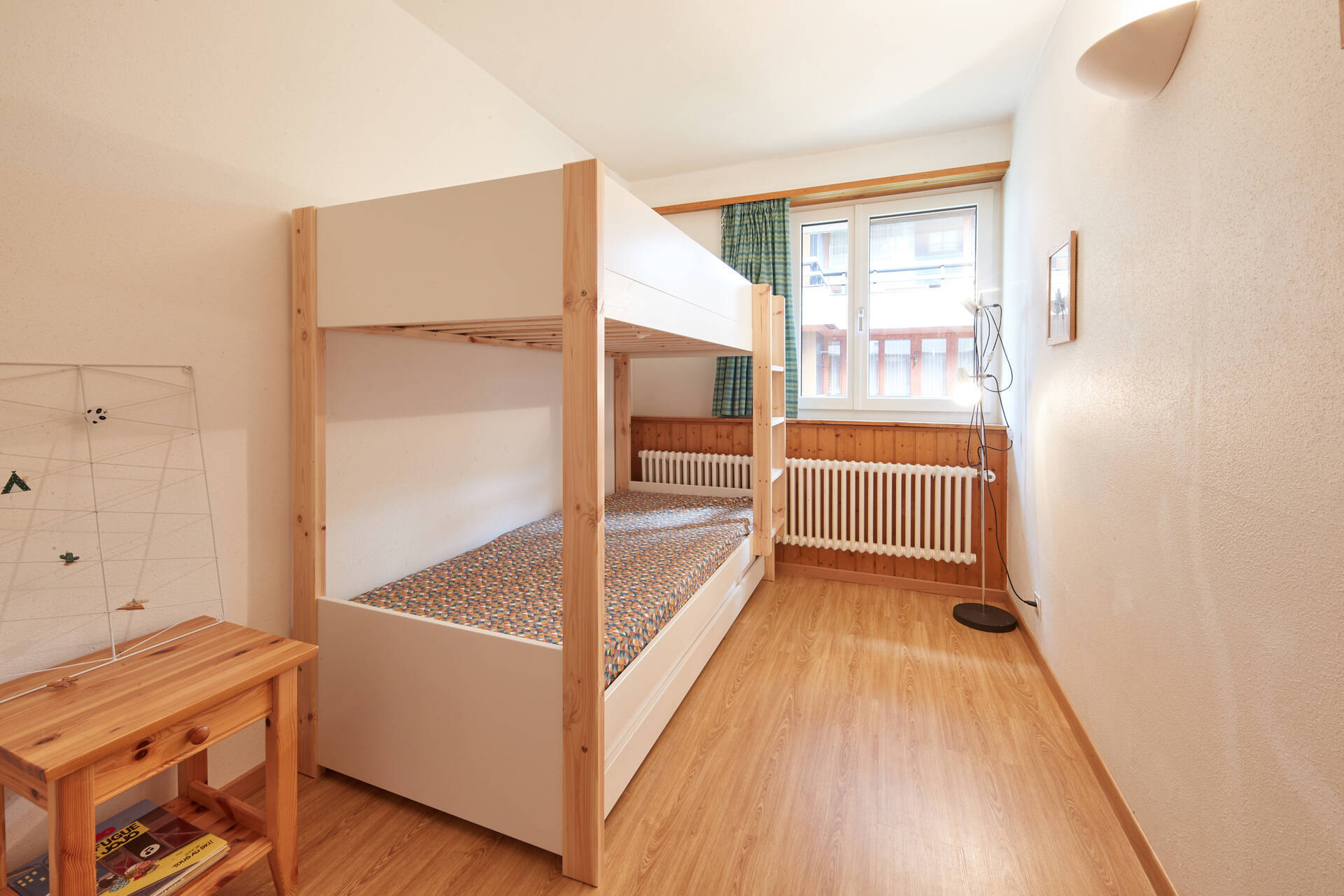 3-rooms-apartment (type K) for 6 people on the 1st floor of the building Essert in Thyon 2000. It has an open kitchen: 4 ceramic hobs, oven, dishwasher and fridge (with a small freezer). The living room, with TV, is composed of a lounge (1 double sofa bed 2.00 X 1.60) and a dining area. Bedroom with a double bed (2 mattresses, 2.00 X 1.00) and children room with a bunk bed (1.90 X 0.90). Bathroom: WC, sink and bath. Westside balcony with view on the main square of Thyon 2000. Apartment WITHOUT carpet. Pets allowed. Important information: Renovated object for 01.12.2022