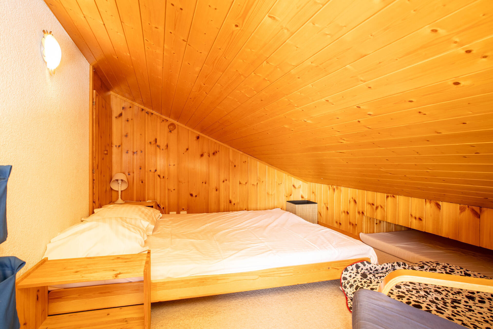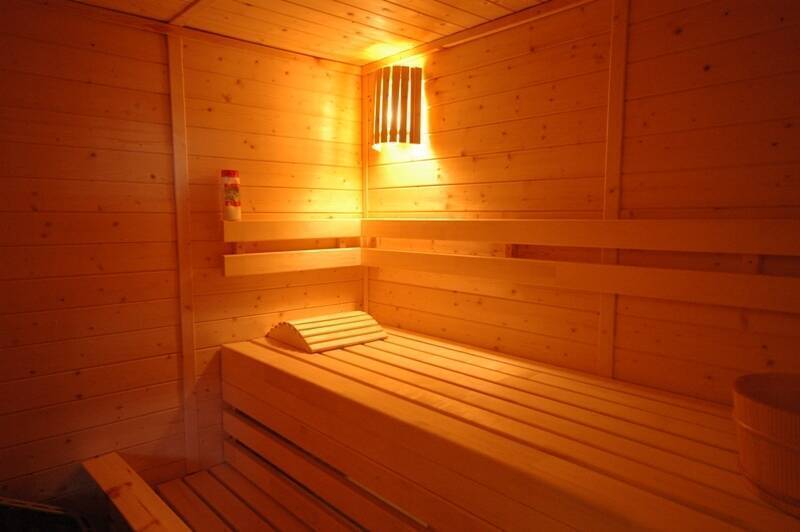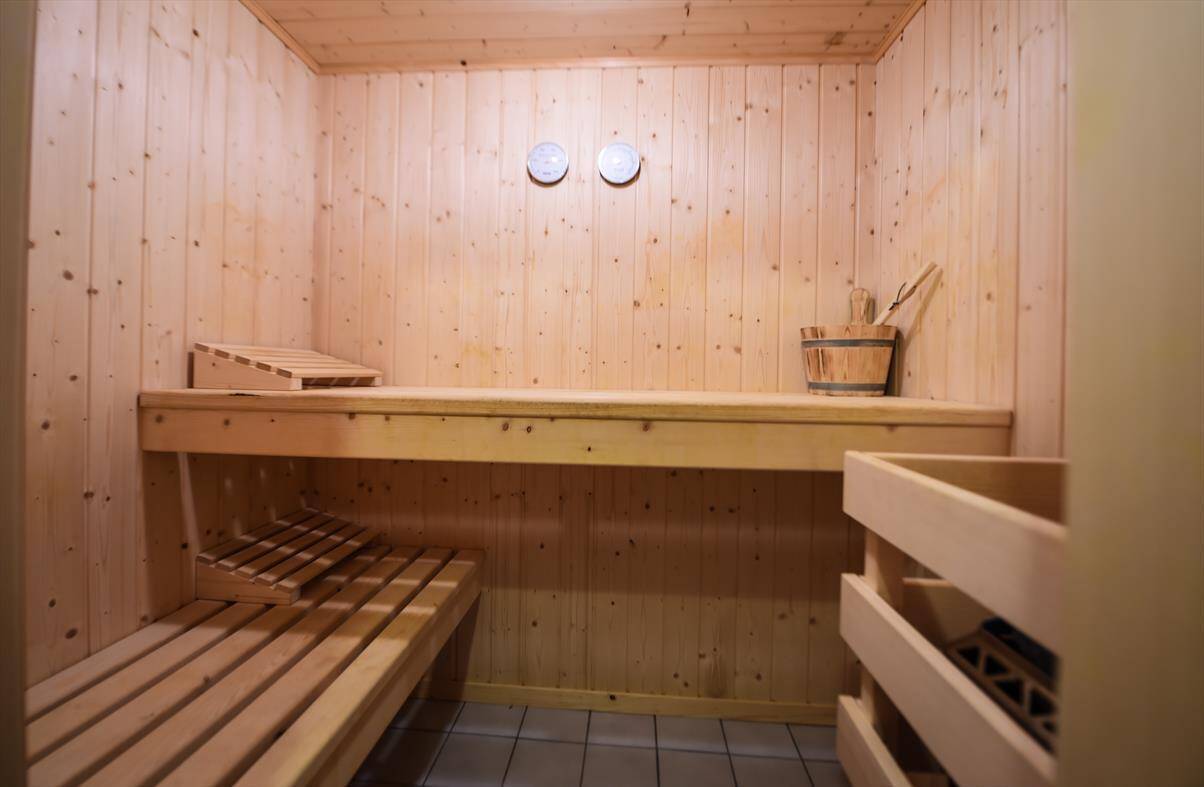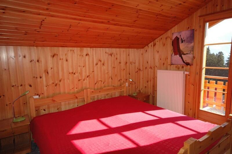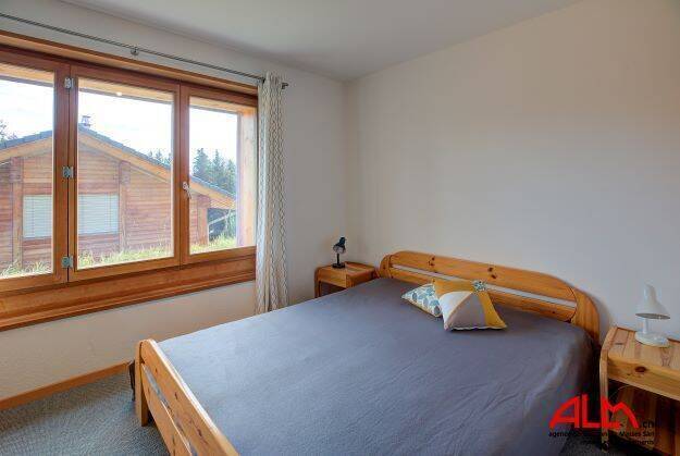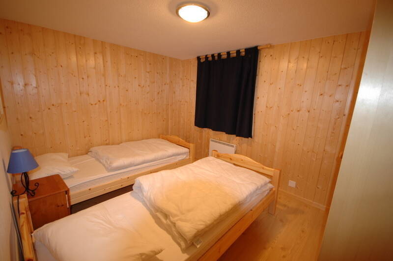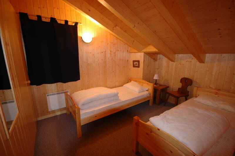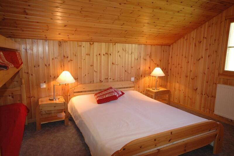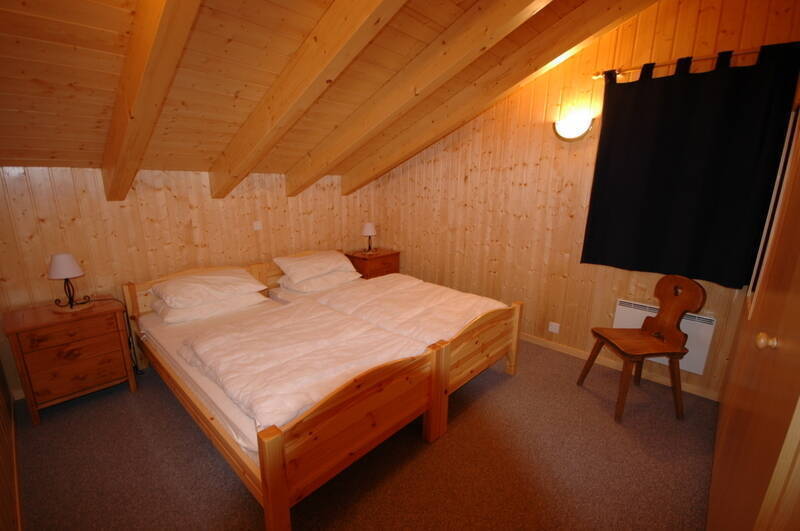 The right part chalet has : 1 bedroom with double bed, 1 bedroom with a bunk beds, 1 bathroom with shower/WC and a sauna.