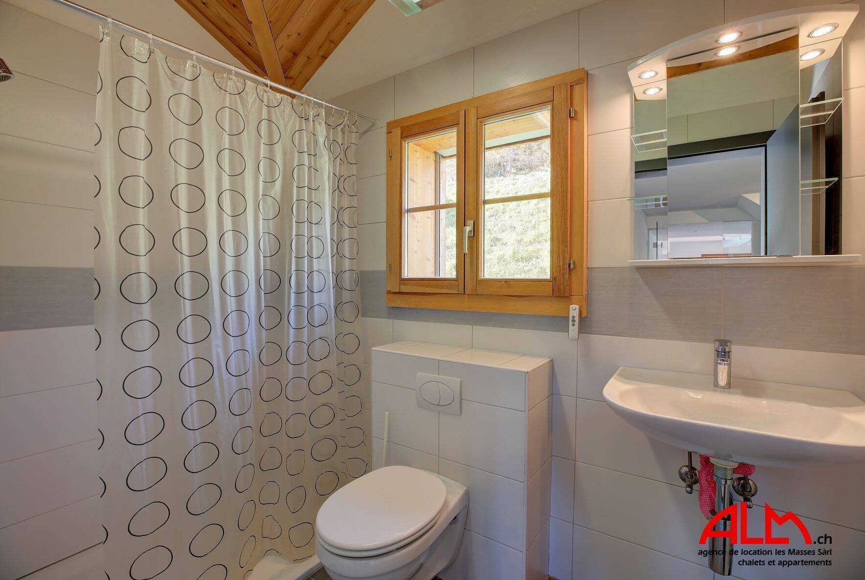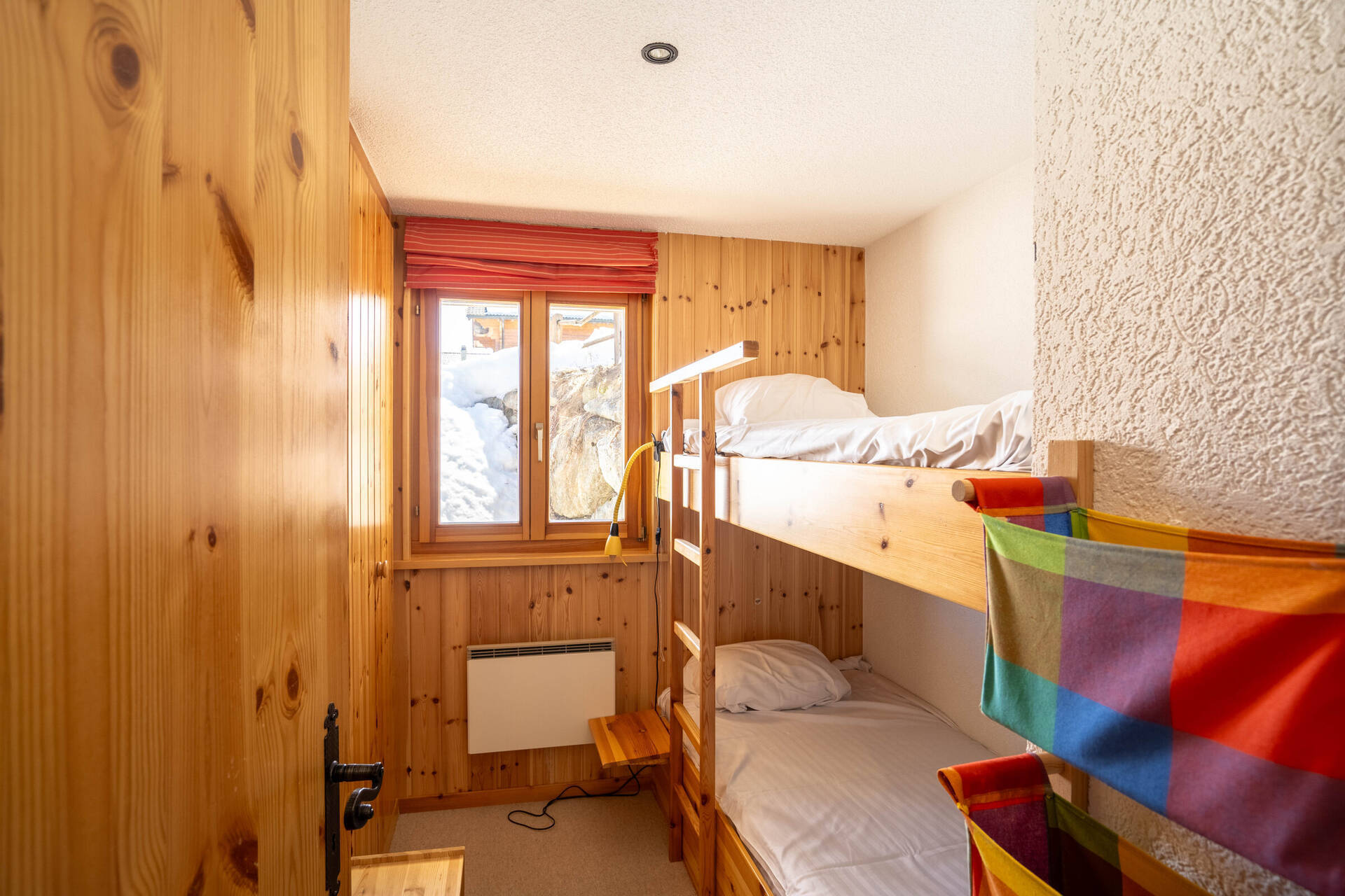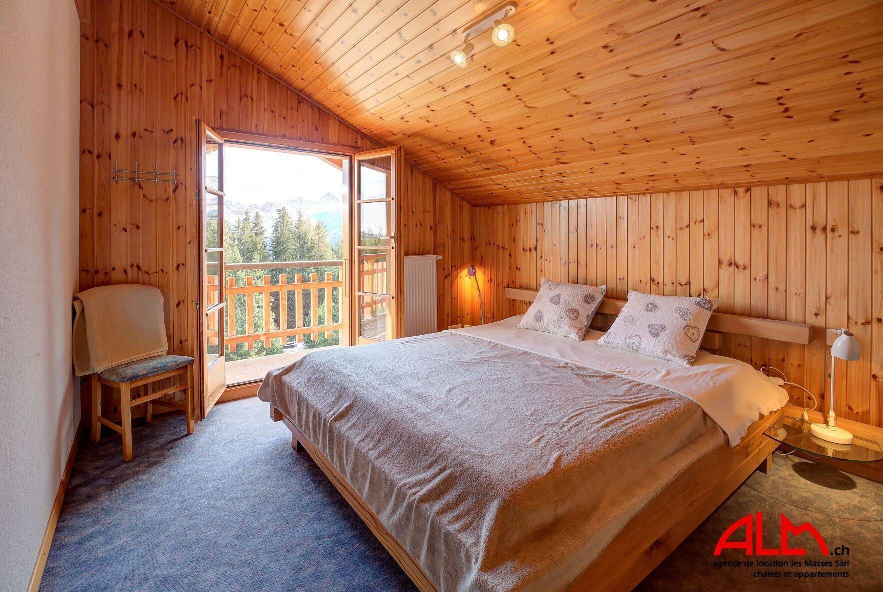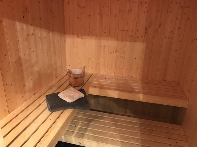 The right part chalet has : 1 bedroom with double bed, 1 bedroom with a bunk beds, 1 bathroom with shower/WC and a sauna.