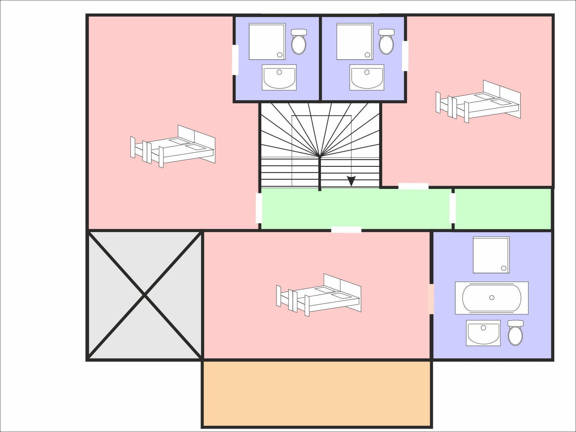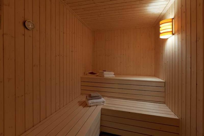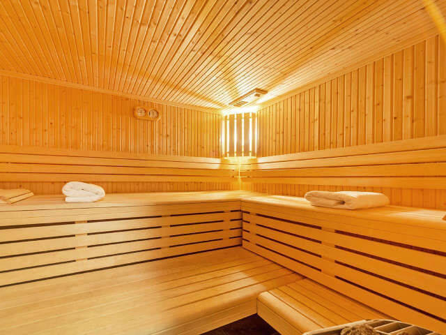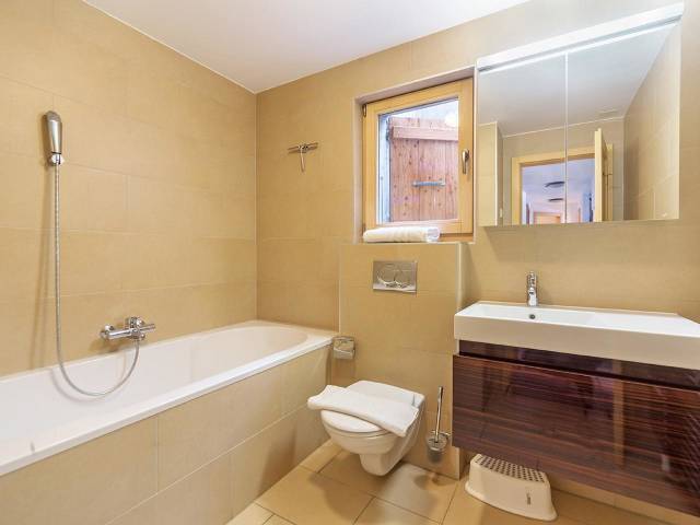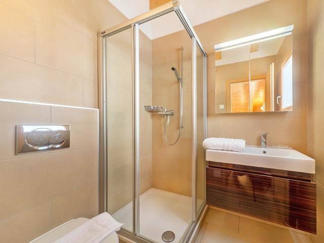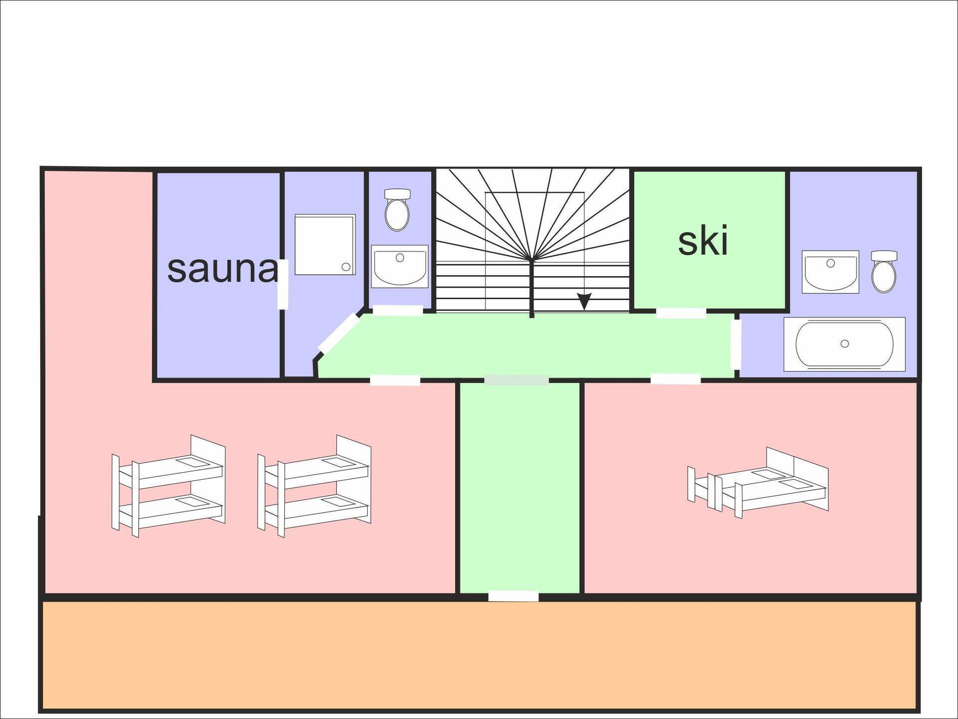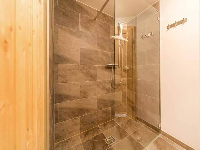 There is a double bedroom as well as a bedroom with two bunk beds, which share a bathroom with WC. The sauna, accompanied by a shower and a separate toilet, is also located on this level. A cloakroom with a shoe dryer is at your disposal.