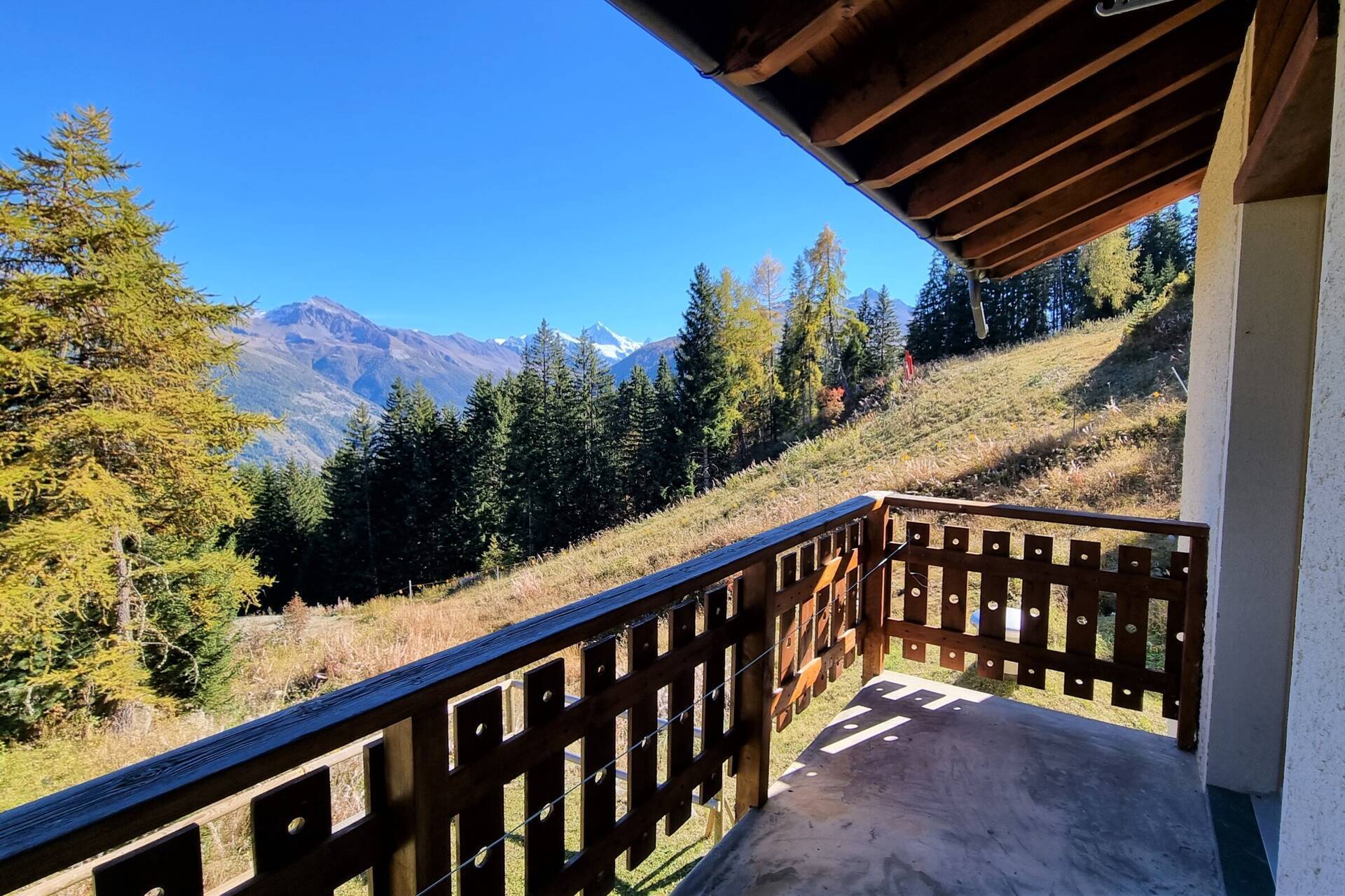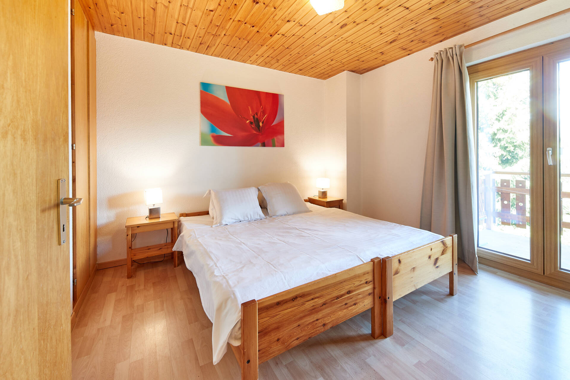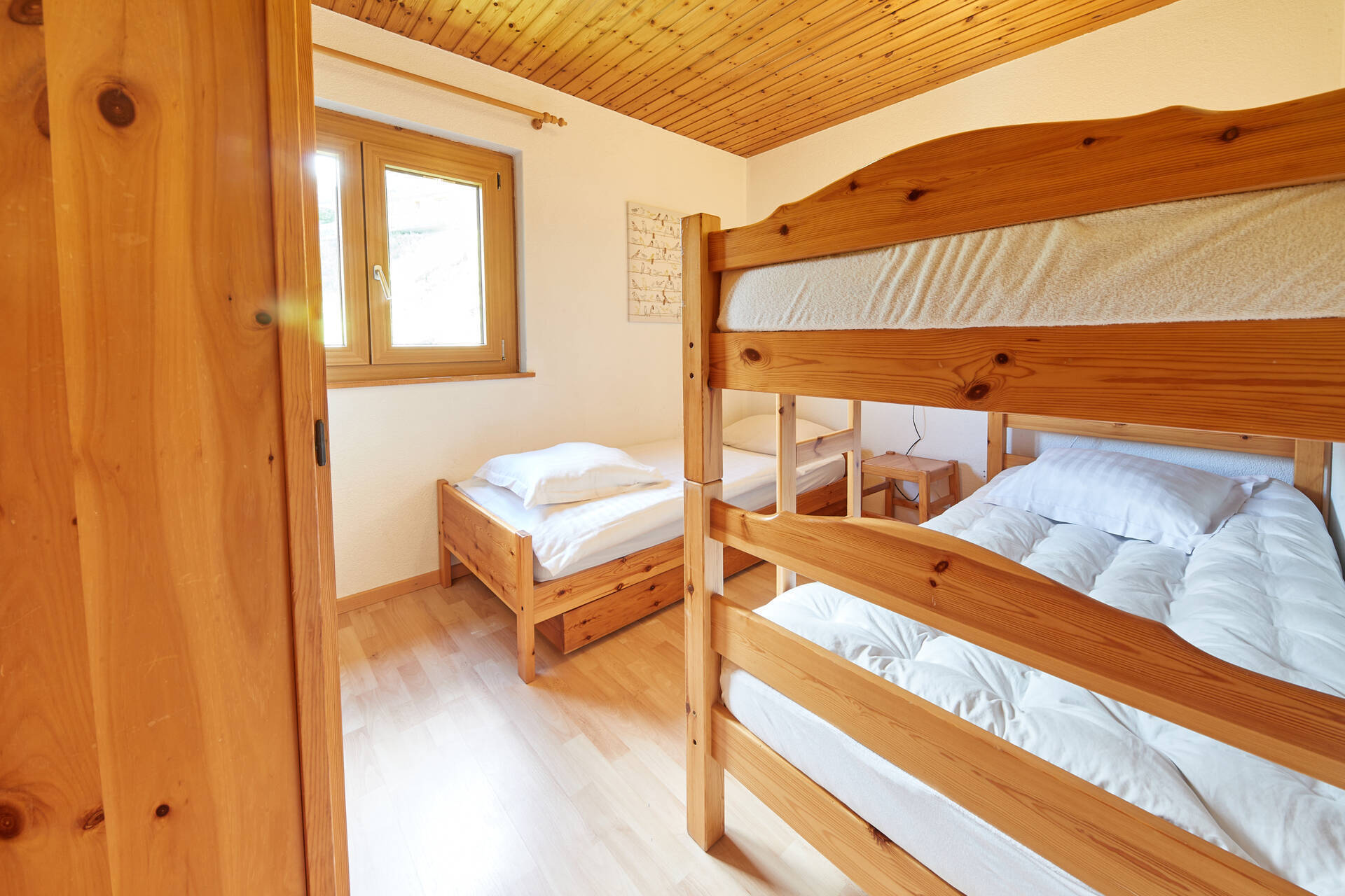 Chalet Lilas is a 5 room apartment for 9 persons. It has an open kitchen: 4 ceramic hobs, oven, large fridge (with freezer section), dishwasher, Nespresso coffee machine, filter coffee machine, toaster, microwave oven, kettle, fondue pot, raclette oven. The living room, with cable TV and WIFI, has a sitting area (1 corner sofa, 2 armchairs) and a dining area. Bedroom 1 with double bed (2 mattresses, 1.90 X 0.90), bedroom 2 with double bed (2 mattresses, 1.90 X 0.90), children's bedroom with 1 bunk bed and 1 single bed (3 mattresses, 1.90 X 0.90), bedroom on the lower floor with 2 single beds (2 mattresses, 1.90 X 0.90). Bathroom 1: WC, washbasin and bath. Bathroom 2: WC, washbasin and shower. Balcony and terrace on the east side with view of the Val d'Hérens. Chalet WITHOUT carpets. No pets allowed.