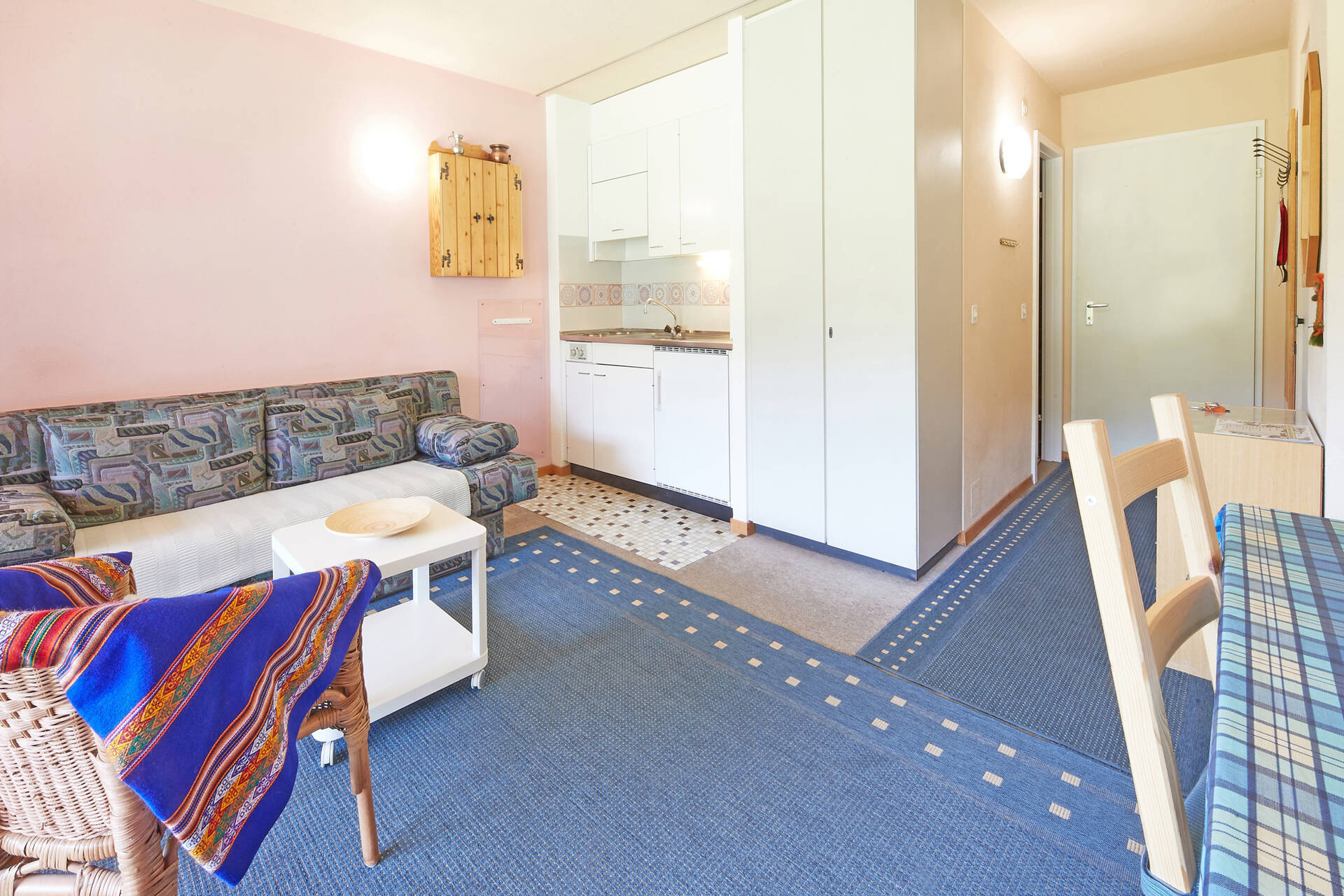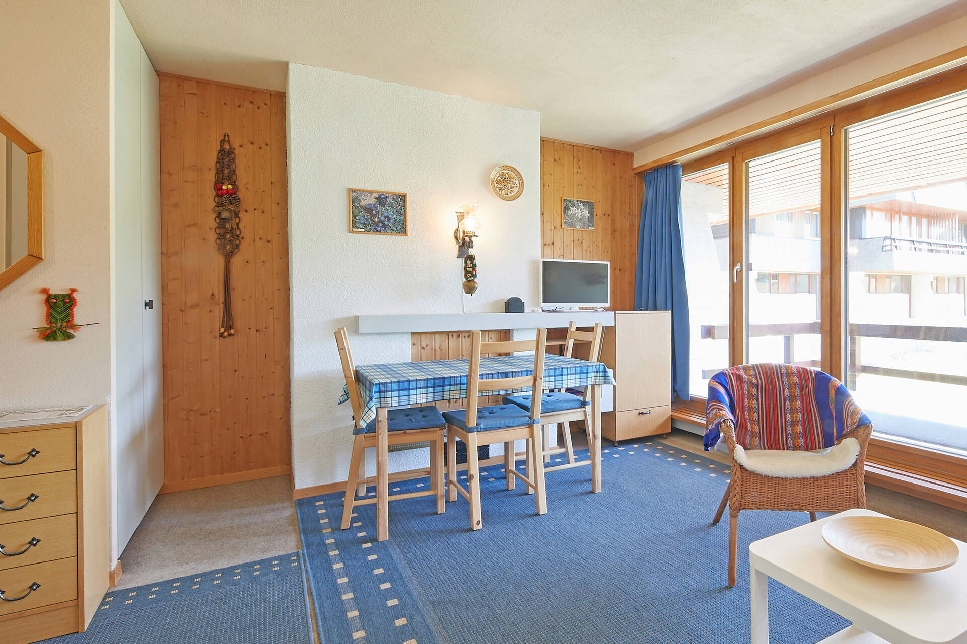NouveautéStudio (type A) pour 2 personnes, situé au 1er étage de l'immeuble Vélan à Thyon 2000. Il dispose d'une cuisine ouverte : 3 plaques électriques, four et frigo. Le séjour, avec TV, est composé d'un coin salon (1 lit rabattable 1.40 X 1.90, 1 canapé-lit double, 1 lit rabattable simple) ainsi que d'un coin à manger. Salle de bain : WC, lavabo et baignoire. Balcon côté est avec vue sur la place centrale de Thyon 2000. Appartement SANS moquette. Animaux acceptés.
